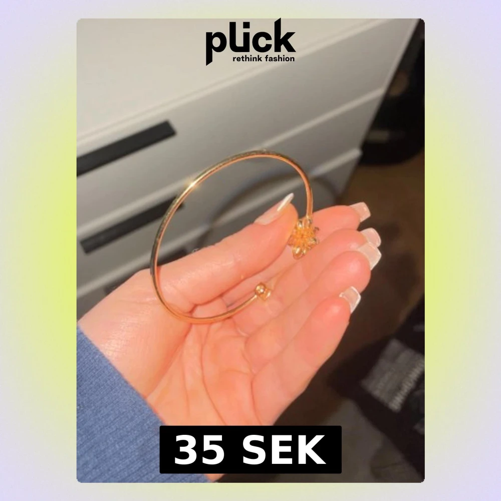 Säljer ett tunnt guldfärgat armband med en diamant/sten blomdetalj och en liten sten på ena sidan. Den har en rund form och är enkel att matcha med olika stilar. Perfekt för dig som gillar bling och vill ha något som sticker ut. Tyvärr har en Sten från blomman låssat på den använts mycket!