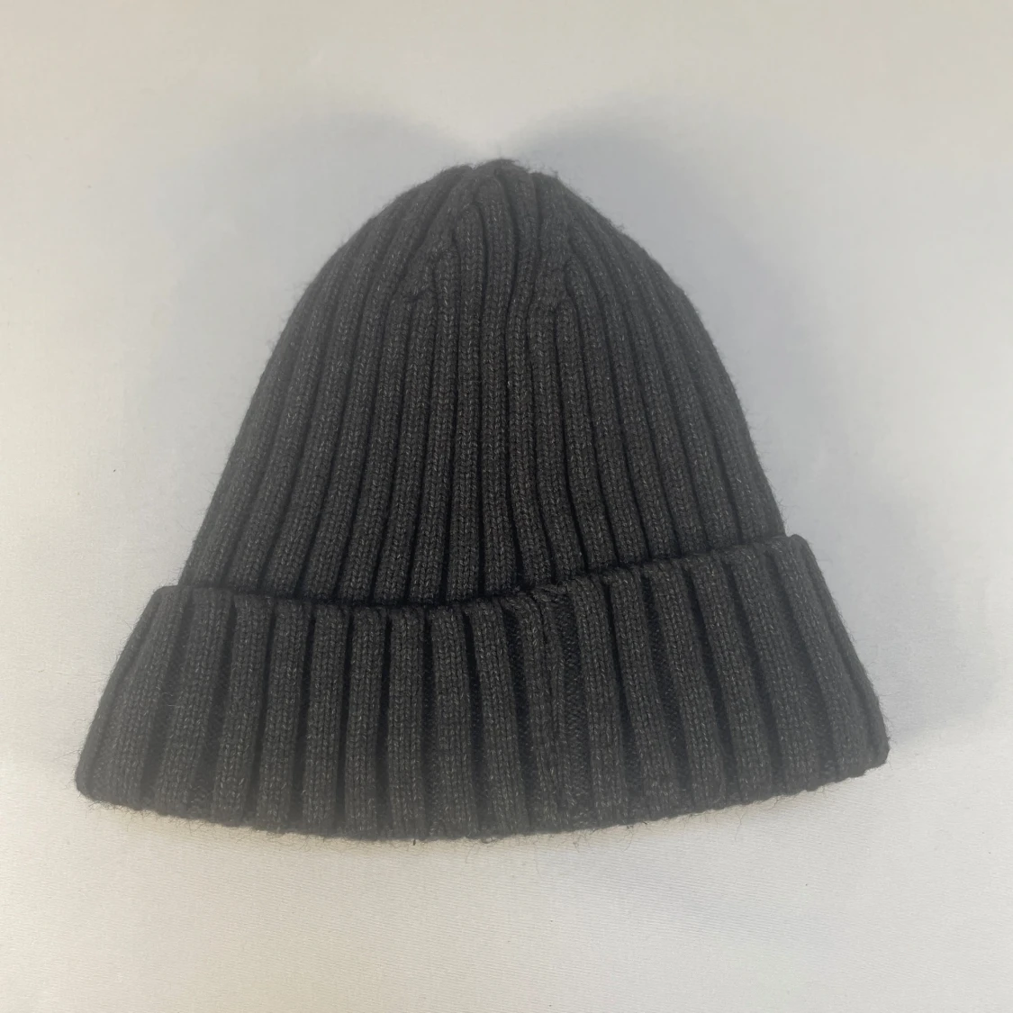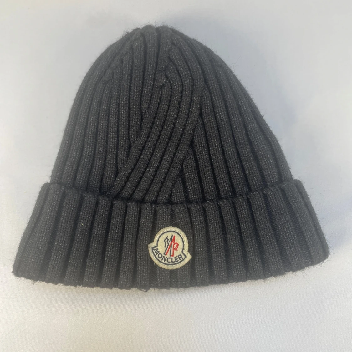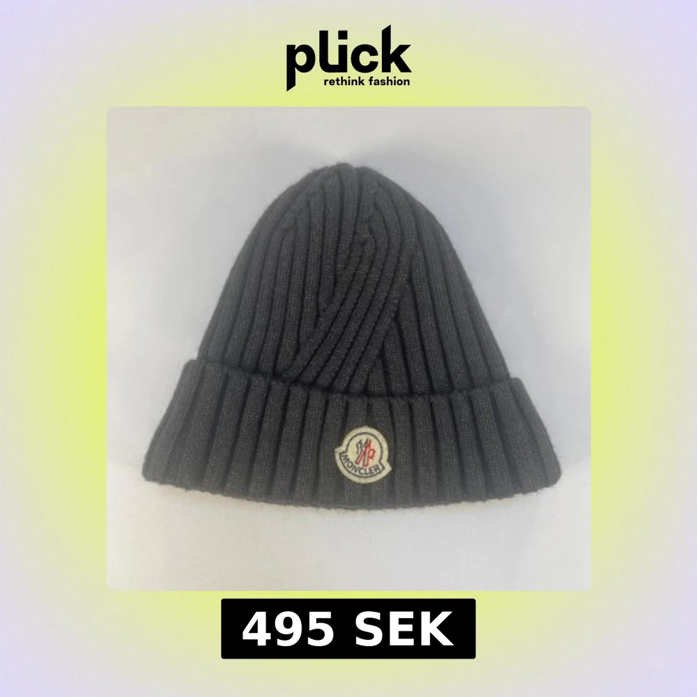 Mörkgrå ribbstickad mössa från Moncler med klassisk uppvikt kant och broderad logotyp framtill. Insidan är fodrad med mjuk, lurvig syntet för extra värme och komfort. Perfekt för kalla dagar när du vill ha både stil och värme. Mössan var inköpt i butik för ca 10 år sedan