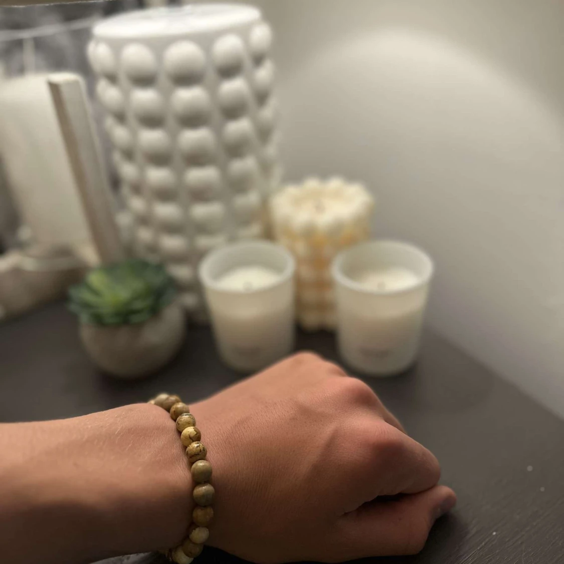 Snyggt armband med runda pärlor i olika beige och bruna toner. Pärlorna är av sten och har naturliga mönster som gör varje armband unikt. Perfekt accessoar för en chill och stilren look.