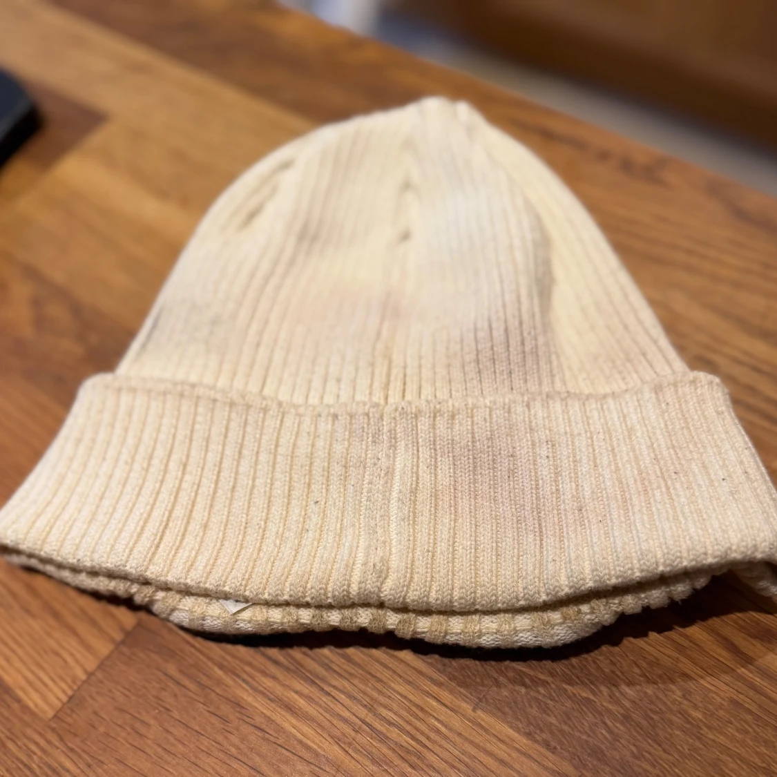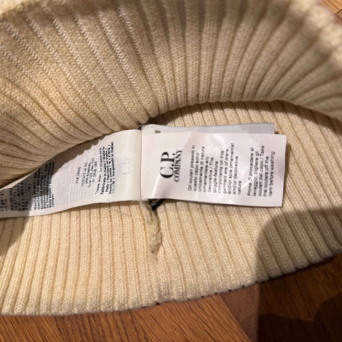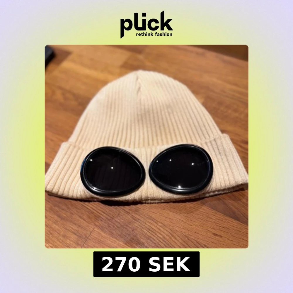 Ribbstickad beige mössa från C.P. Company med ikoniska svarta goggle-linser framtill. Mössan har uppvikt kant och är tillverkad i mjuk bomull som ger en skön passform. Perfekt för dig som vill sticka ut med en unik streetwear-accessoar. Den mössan är lite smutsig på baksidan