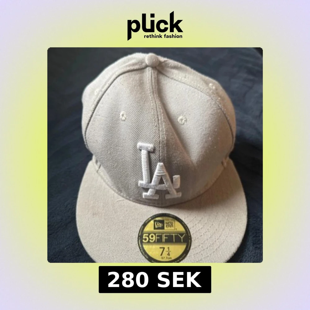 Säljer en beige keps från New Era 59FIFTY med LA-logga framtill. Kepsen har en klassisk rak skärm och är i bomullsmaterial. Perfekt för dig som gillar sportiga accessoarer och vill ha en stilren look.