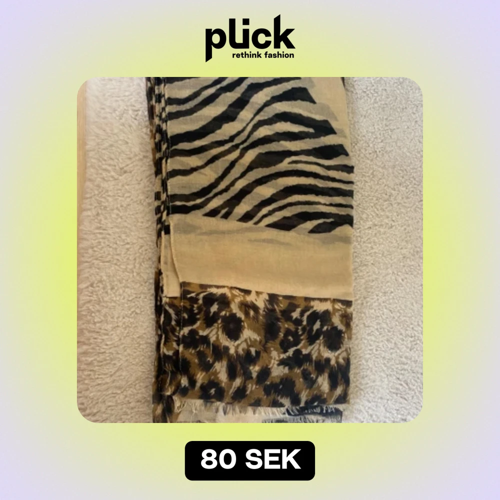 En beige halsduk med ett djurmönster i svart och brunt. Halsduken har både zebra- och leopardmönster, vilket ger den ett unikt och stilfullt utseende.