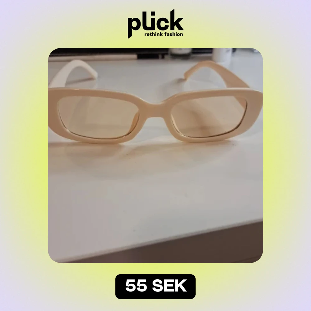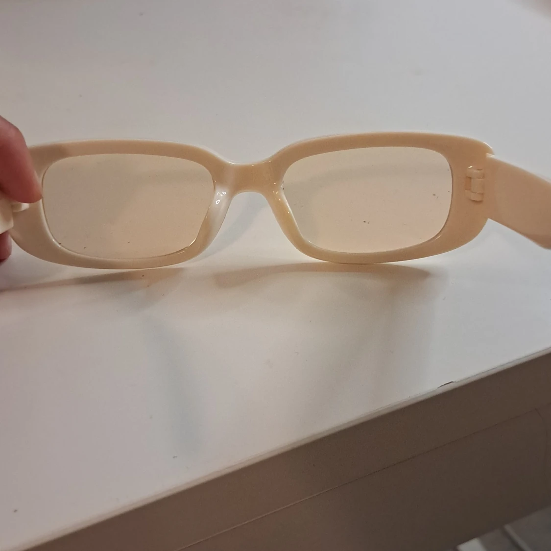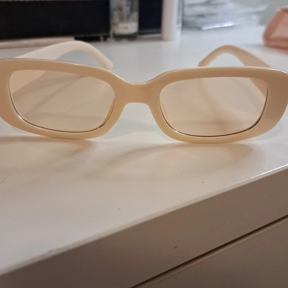 Ett par stilrena beige rektangulära glasögon med transparenta linser. Glasögonen har en modern design med breda skalmar och en solid färg som ger ett elegant intryck.
