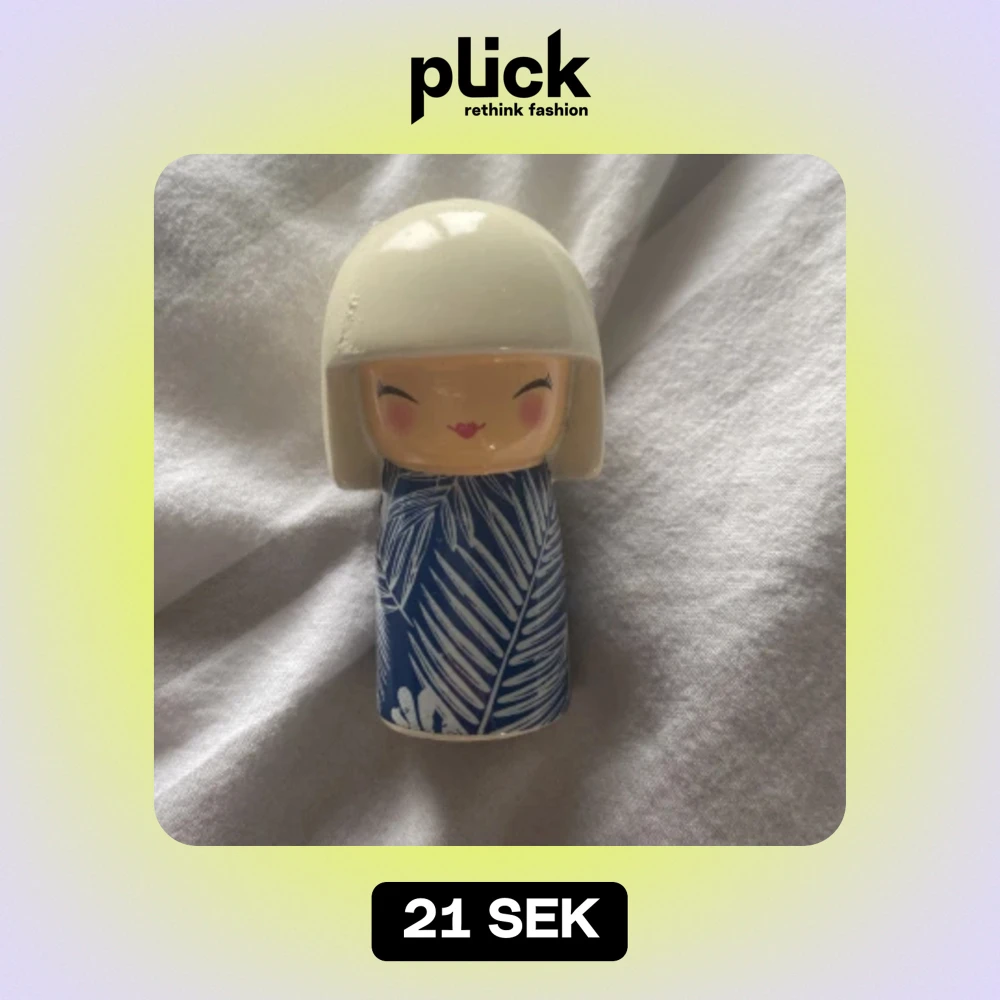 En söt liten docka från Skincity med en vit bobfrisyr och ett blått klänning med vita bladmönster. Perfekt som en liten dekoration eller present. Dockan har ett glatt ansikte med rosiga kinder och röda läppar. Den är tillverkad med kärlek och är miljövänlig.
