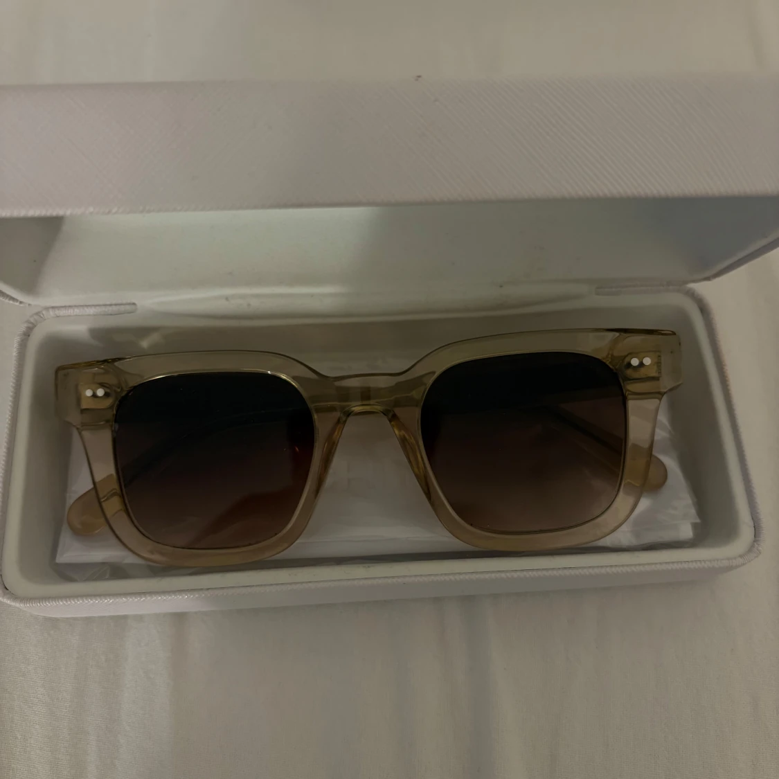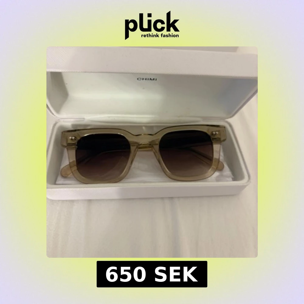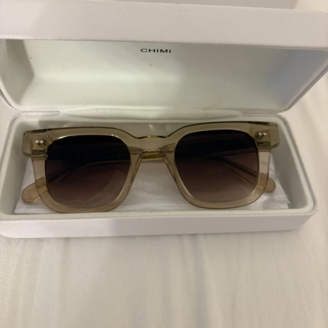Snygga solglasögon från CHIMI i modellen Ecru. Rektangulära bågar i transparent beige plast med bruna tonade glas. Kommer med originalfodral. Perfekta för dig som vill ha en clean och modern look. Använda max 1 gång❤️⚠️Om ni tycker på köp direkt får ni gärna använda postnord för min instabox funkar ej!⚠️Kan gå ner i pris vid snabb affär