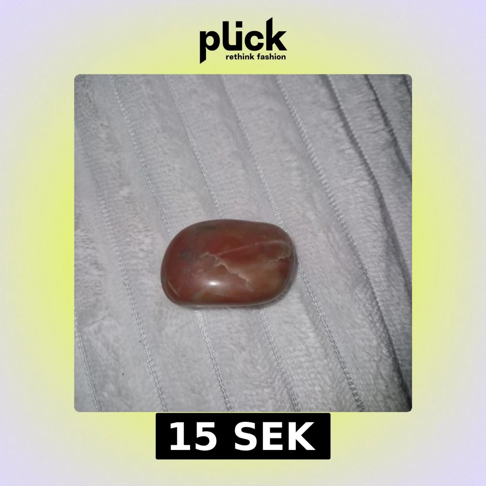 Säljer en brunröd sten med naturliga mönster och skiftningar i beige och vitt. Perfekt som hängsmycke eller att använda i DIY-projekt. Stenen har rundad form som ger en cool och unik vibe.