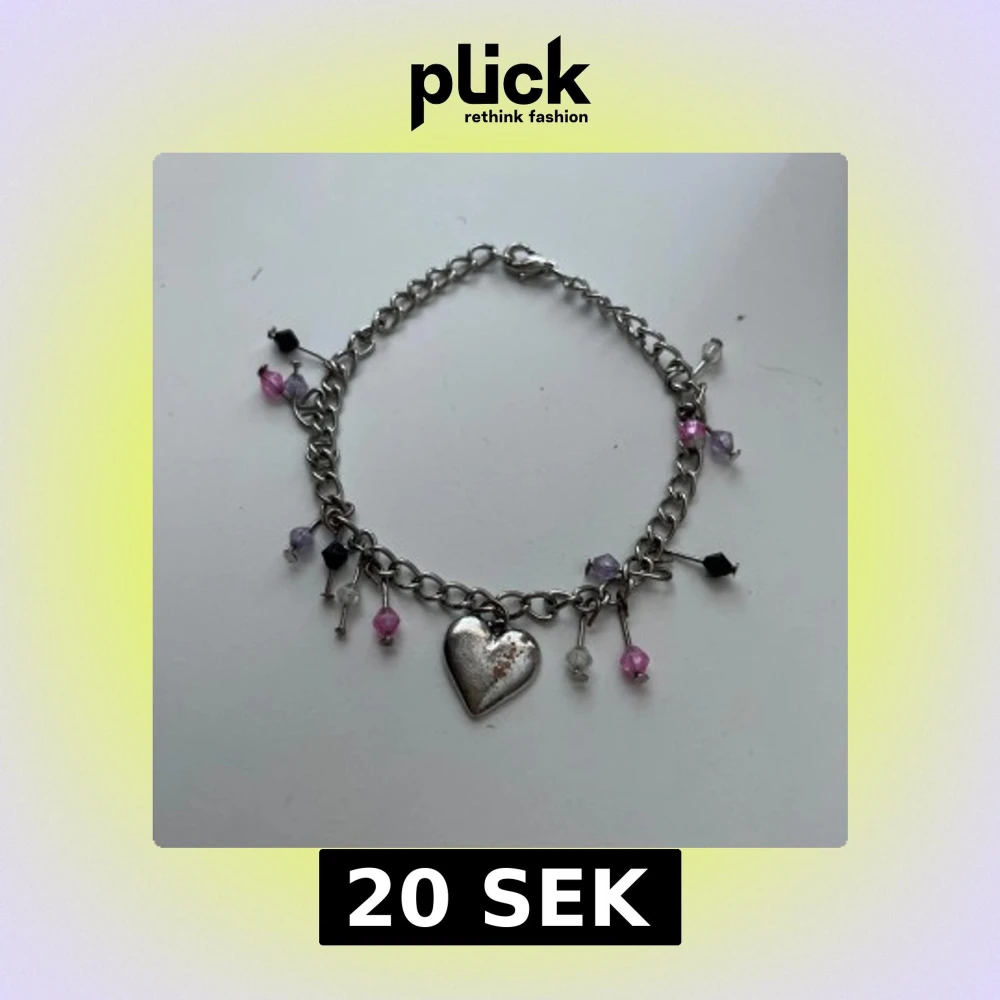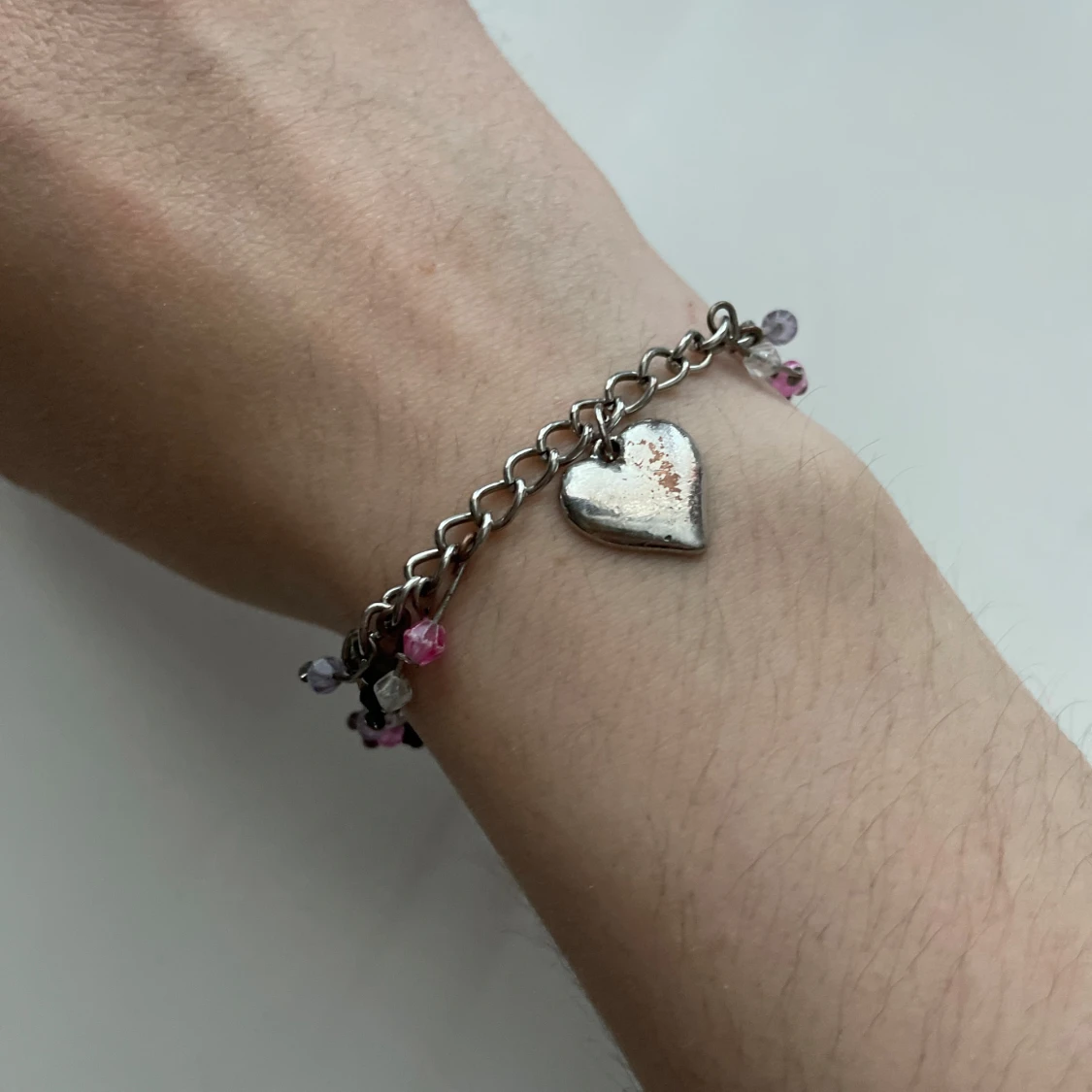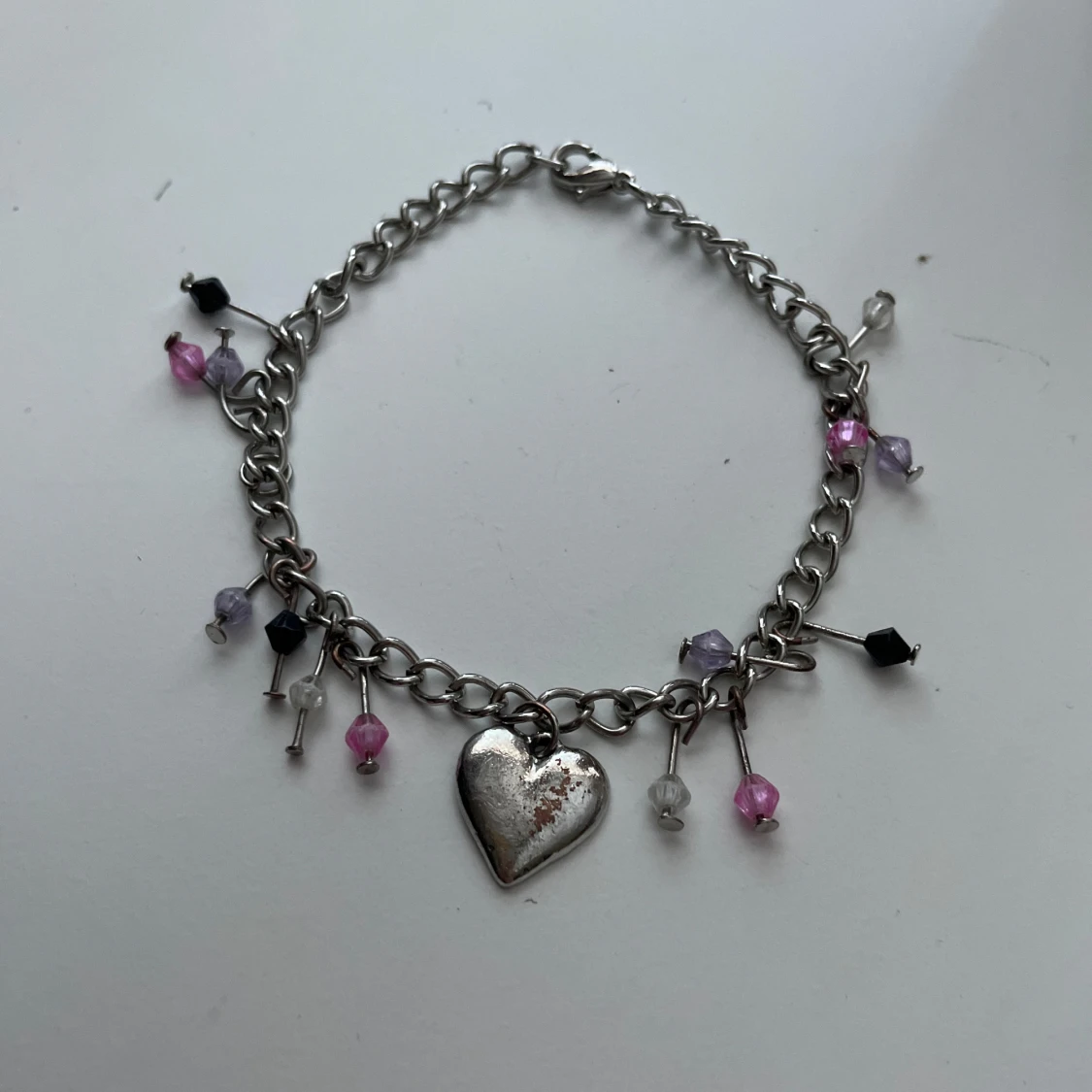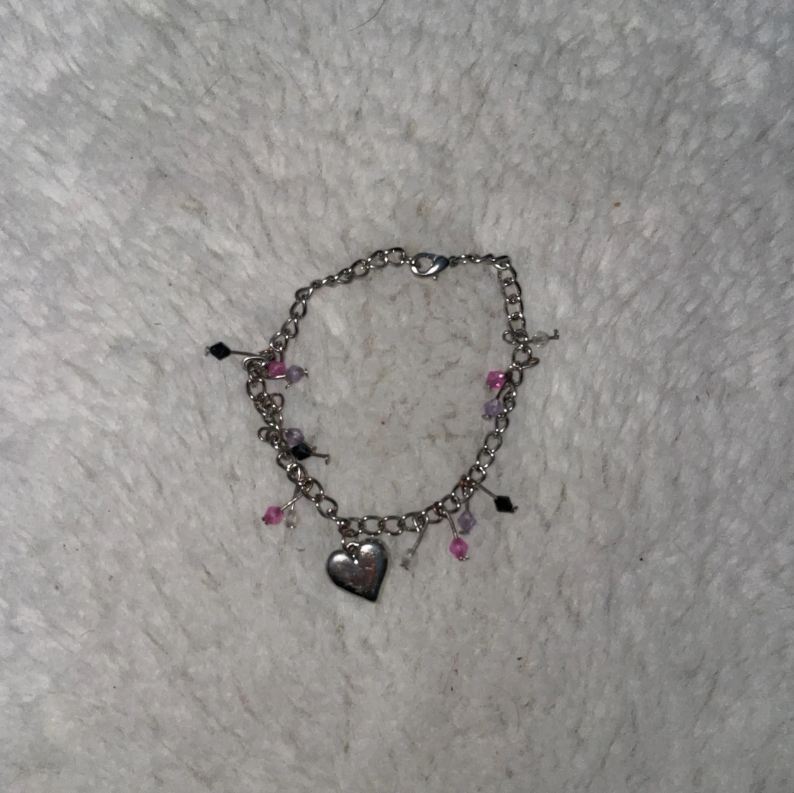 Charmigt armband i silverfärgad metall med ett hjärthänge i mitten. Armbandet är dekorerat med små pärlor i rosa, lila, svart och vitt som hänger längs kedjan. Perfekt accessoar för att ge din stil en söt och lekfull touch.