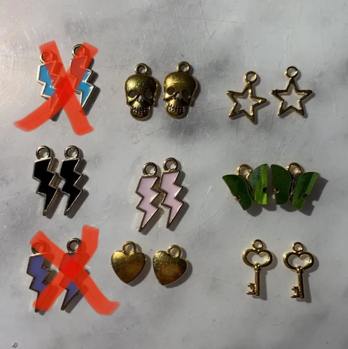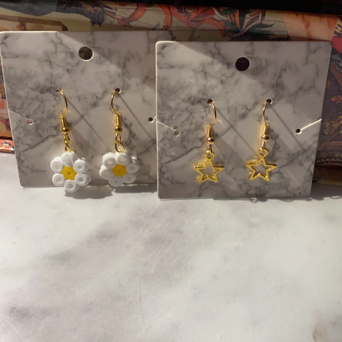 Örhängen med blommor: 10kr + frakt, Örhängen med stjärnor 13kr + frakt. Går att designa egna med berlockerna som visas på andra bilden, priser kan variera. Visar ej på pga hygien.