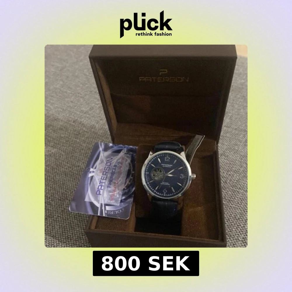 Snygg blå Paterson automatisk klocka med rund urtavla och silverfärgad boett. Urtavlan har ett mekaniskt fönster och stilrena indexmarkeringar. Armbandet är blått och har en skinnstruktur med synliga sömmar. Levereras i original ask med certifikat.