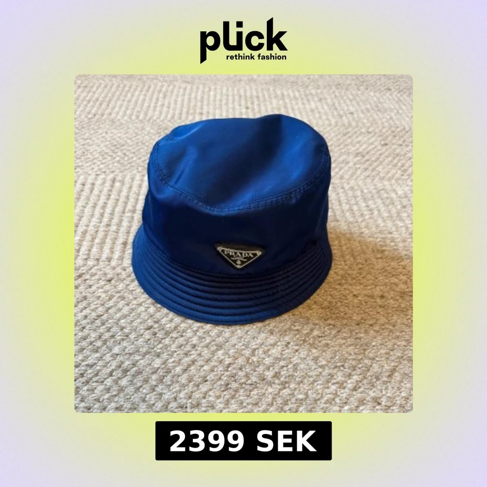 Snygg marinblå bucket hat från Prada med ikonisk metalltriangel framtill. Hatten har en klassisk rund form och är tillverkad i slitstark syntet med svart insida. Perfekt accessoar för att lyfta din streetwear-look.