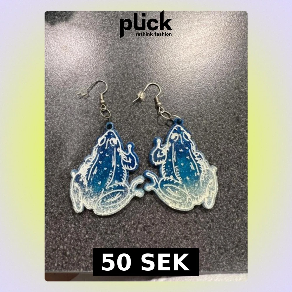 Unika örhängen i form av grodor, med en snygg blå och vit gradient. Ena sidan har ett vitt konturmönster som framhäver grodans detaljer, medan baksidan är mer transparent och skimrande. Perfekt för dig som vill sticka ut med coola accessoarer.