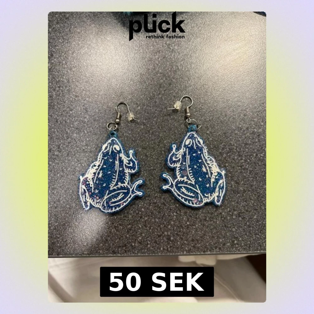 Unika örhängen i form av grodor, gjorda i blått glittrigt material med vita detaljer på framsidan. Baksidan är helblå med inslag av glitter och små färgprickar. Perfekt för dig som vill sticka ut med coola accessoarer!