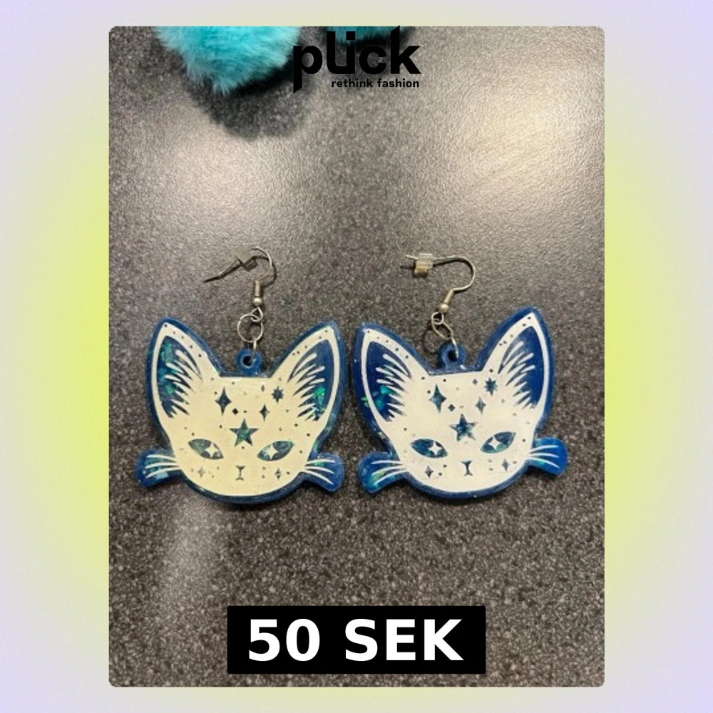 Unika örhängen i form av galax kattansikten med blå och vita färger, dekorerade med stjärnor och glitterdetaljer. Framsidan har ett mystiskt kattansikte med stjärnmönster, medan baksidan är helt blå med glittrande inslag. Perfekt för dig som gillar statement-smycken och coola accessoarer. En av kattern har ett mer vitt ansikte och det andra har ett mer varmare ansikte (kolla någrant på bilderna)