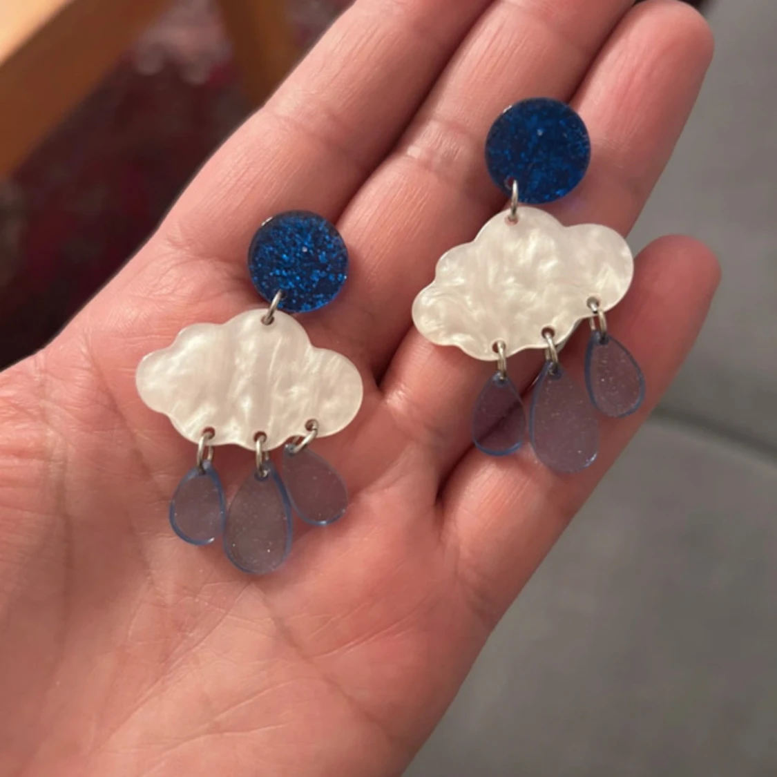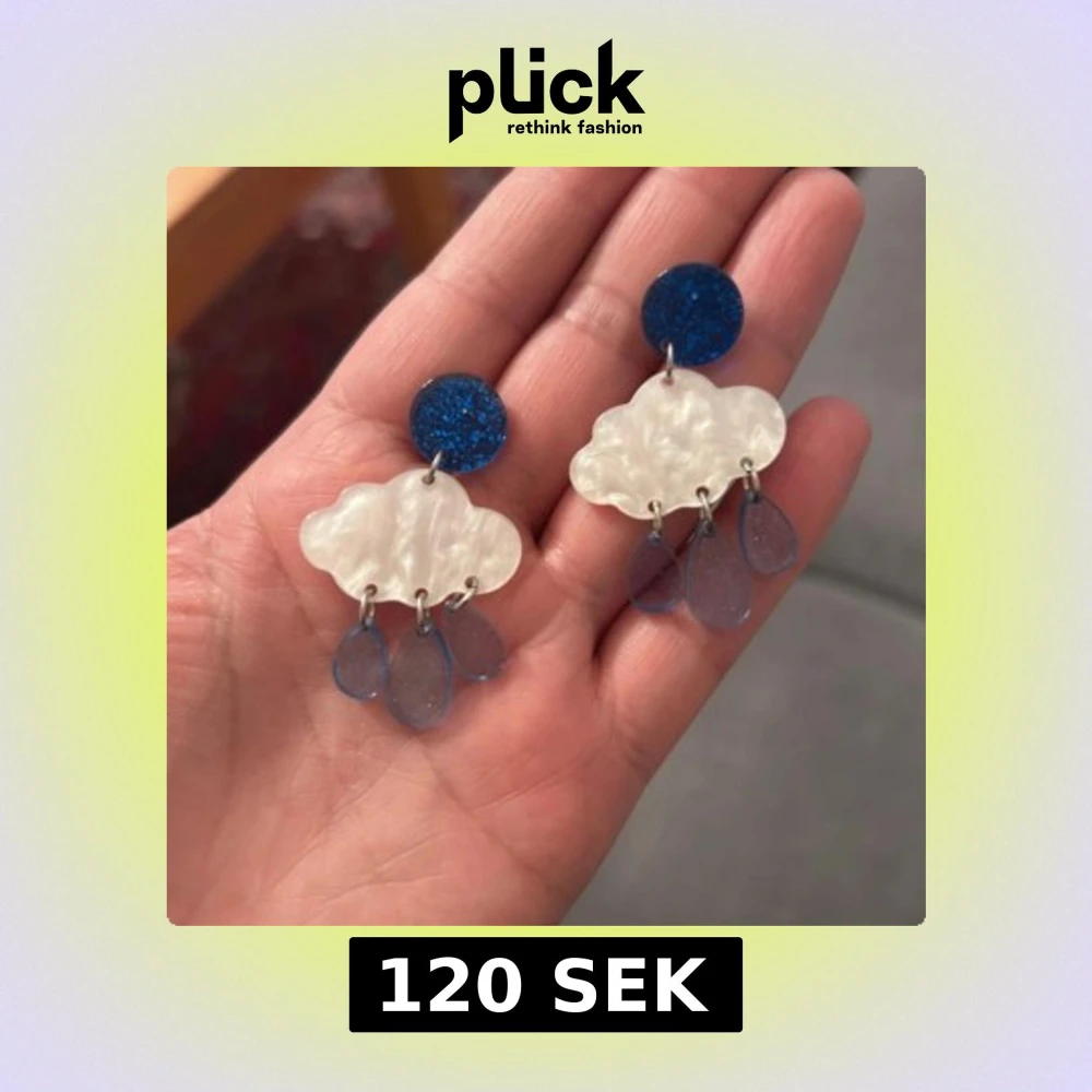 Unika örhängen med blå glittriga cirklar, vita moln i plast och hängande blå droppar som regn. Perfekt för dig som gillar lekfulla och kreativa accessoarer med cool design. Säljs som ett par.