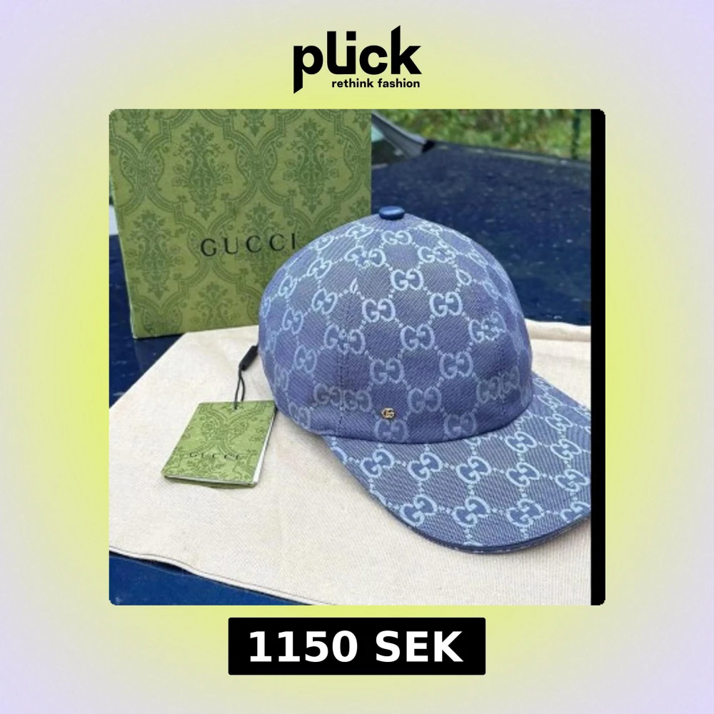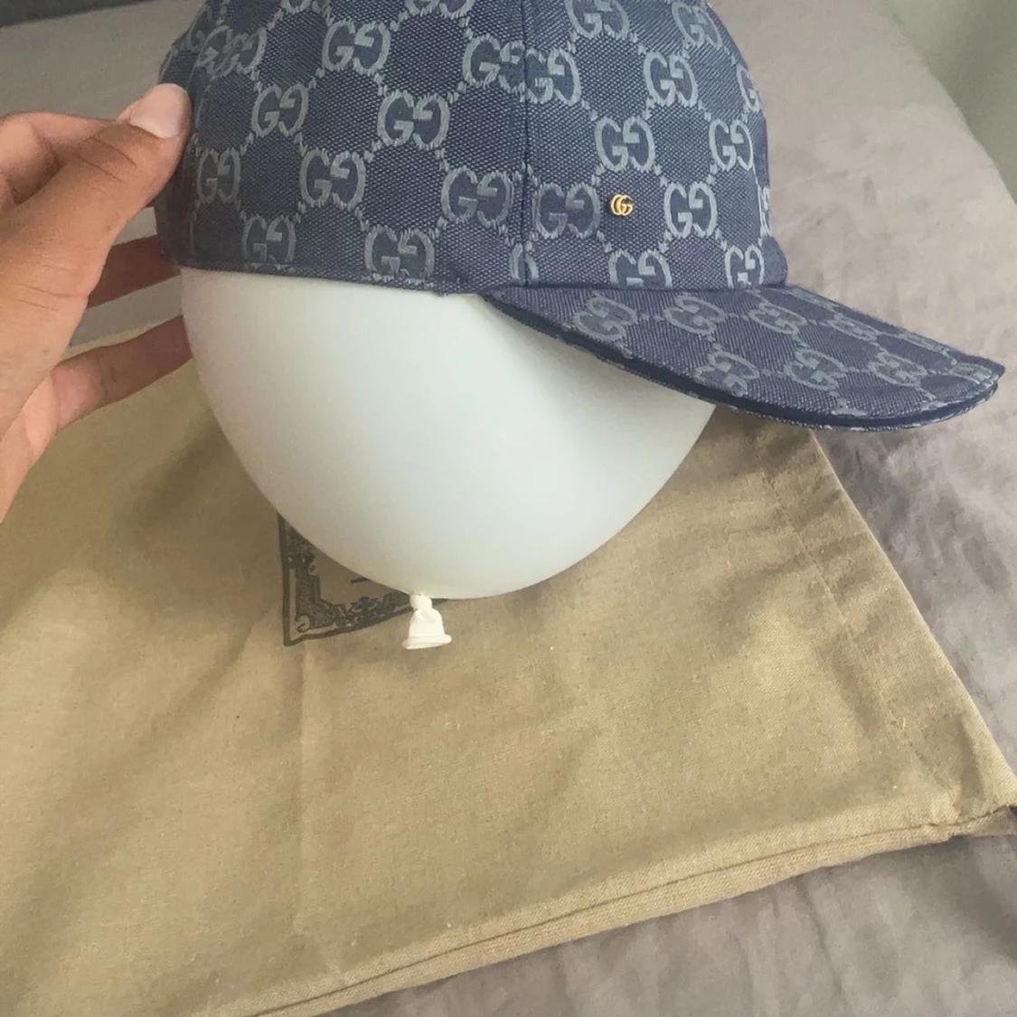 Säljer en blå keps från Gucci med ikoniskt GG-monogram i ljusare blått över hela kepsen. Kepsen har böjd skärm, justerbar rem bak och en liten guldfärgad GG-detalj på sidan. Tillverkad i bomullscanvas och levereras med originalförpackning och tags.