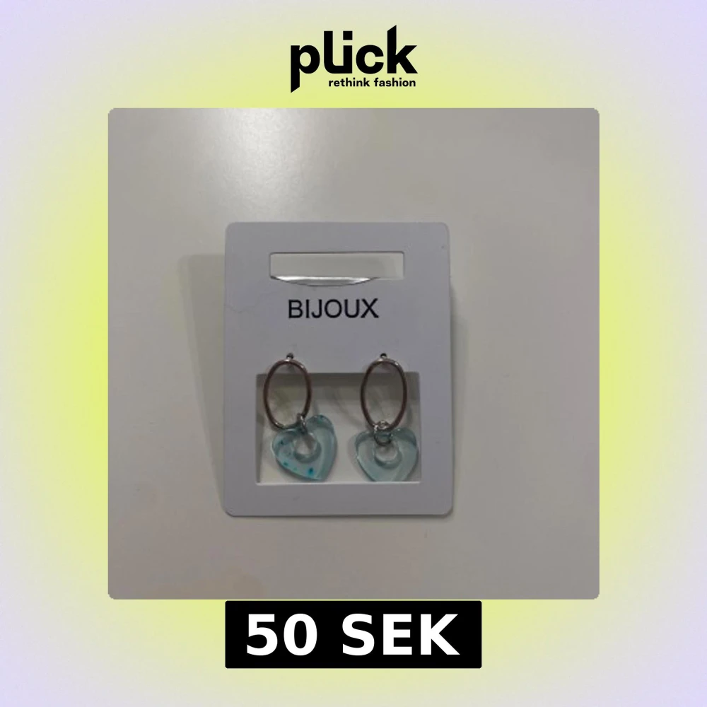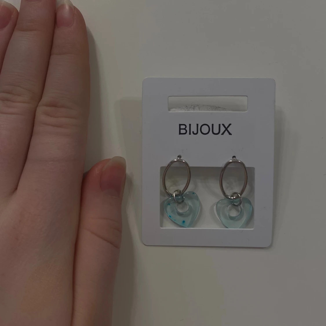 Snygga örhängen med silverfärgade ringar och blå, transparenta hjärtan.. Hjärtana har små blå prickar och hänger i ovala hoops. Perfekta för att ge din look en söt och trendig touch. Väldigt lätta! Köpta på guldfynd och säljer pga att jag endast använder guld, ej silver💋