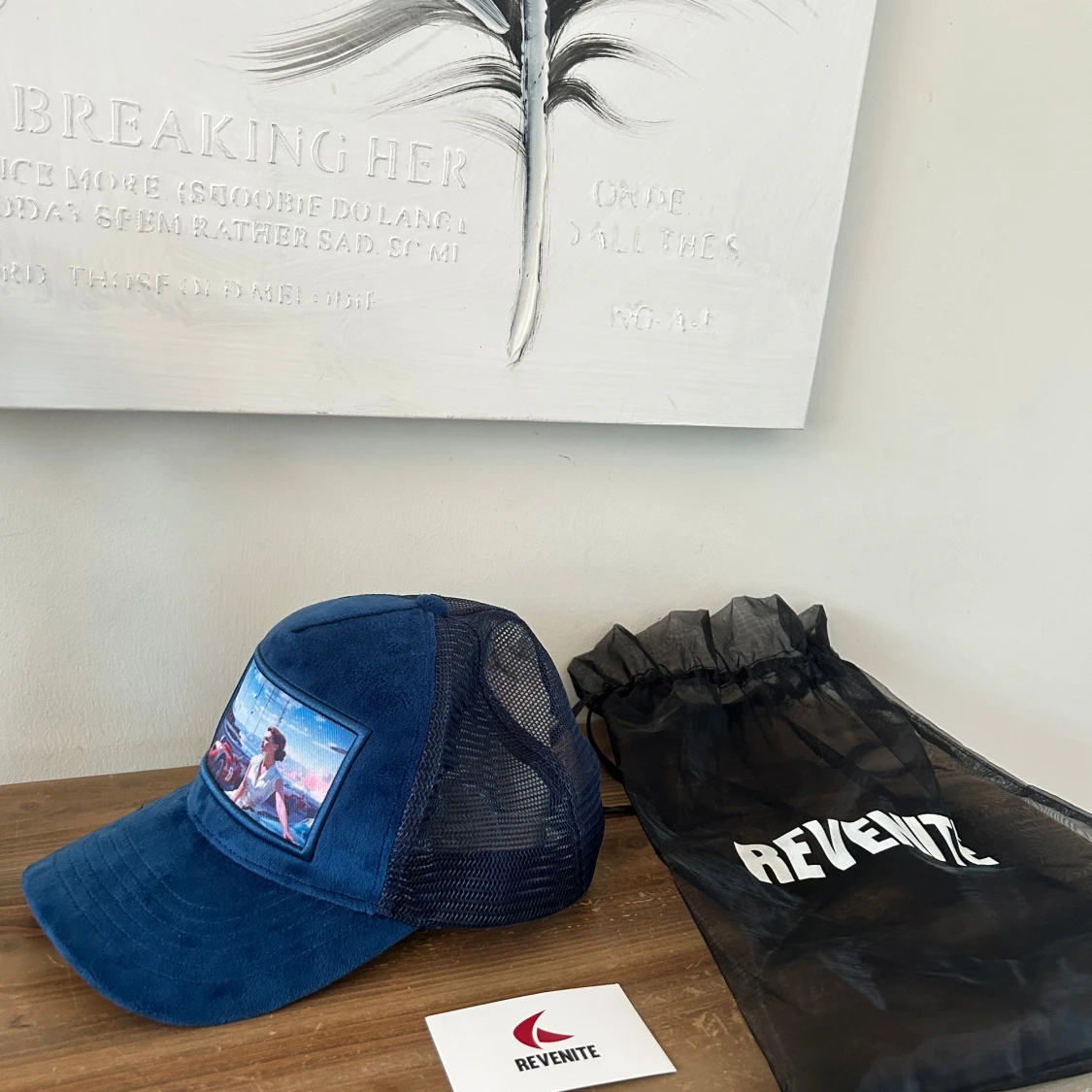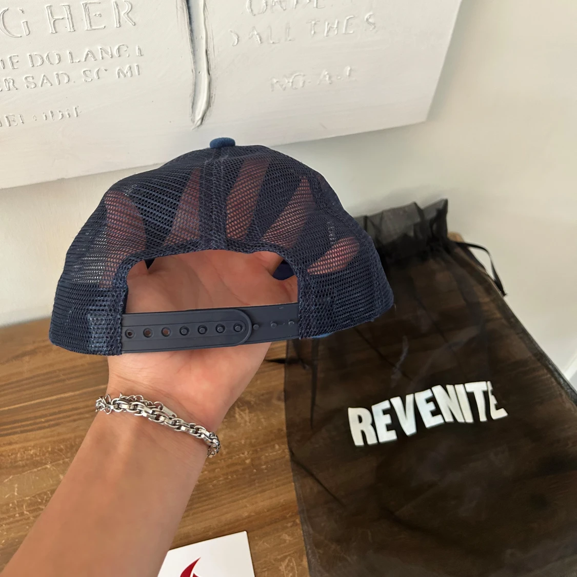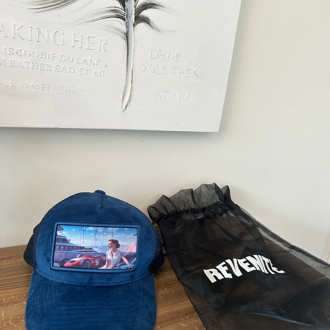 Snygg blå keps från Revenite med vit logga och ett tryck framtill som visar en person och en sportbil. Kepsen har mesh på baksidan och justerbar passform med plastspänne. Den är limited edition den kommer aldrig släppas igen och släpptes bara 100 stycken säljer pågrund av den har inte kommit till användning, den är inte använd nån gång enbart testad ! Skriv vid minsta lilla fundering ! Köpt för 600 mitt pris 800 pris kan diskuteras så de är inte hugget i sten!