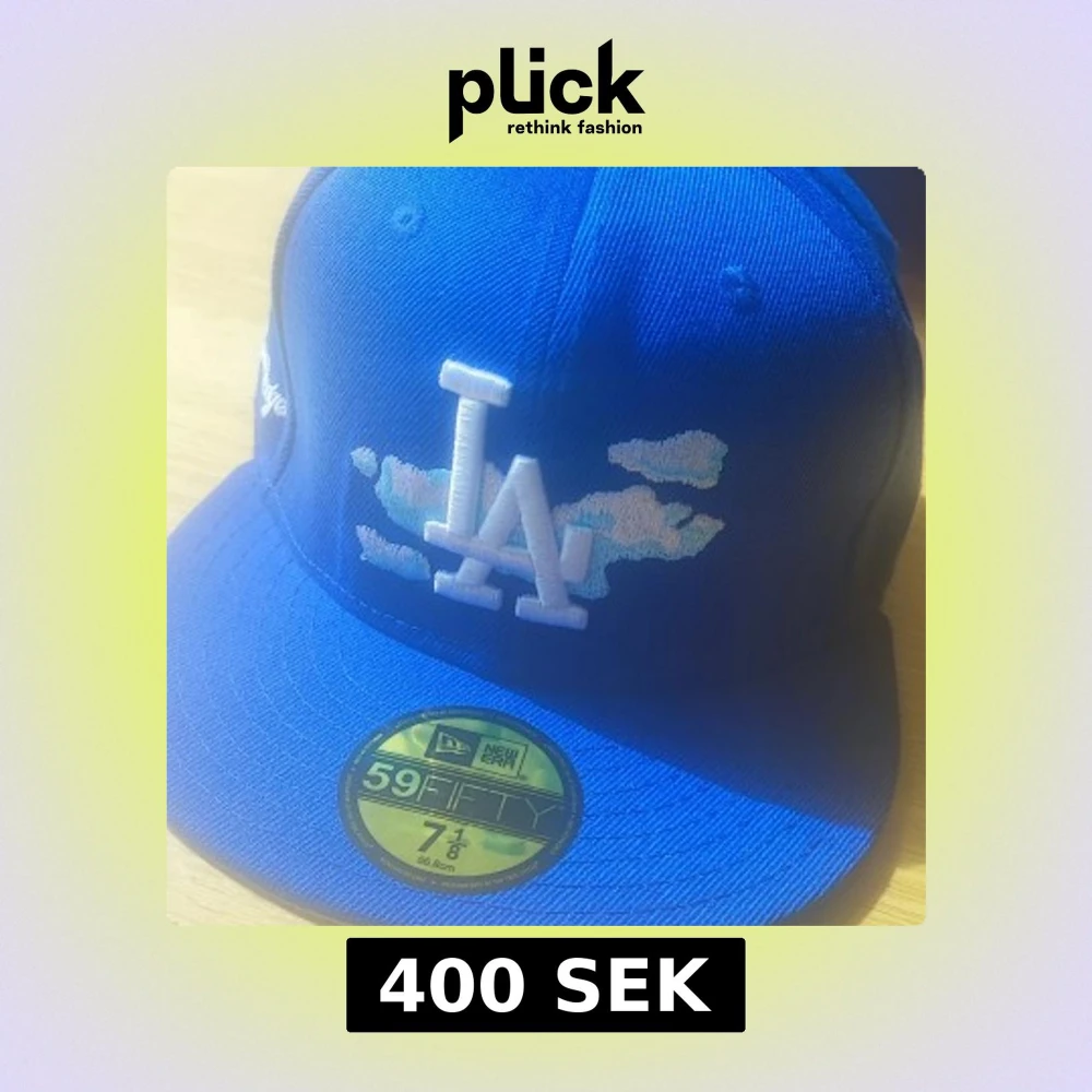 Säljer en blå 59FIFTY keps från New Era med LA Dodgers brodyr framtill och molndetaljer. Kepsen har broderad text på sidan och MLB-logga bak. Klassisk flat peak och strukturerad passform. Perfekt för dig som vill sticka ut med sportig stil.