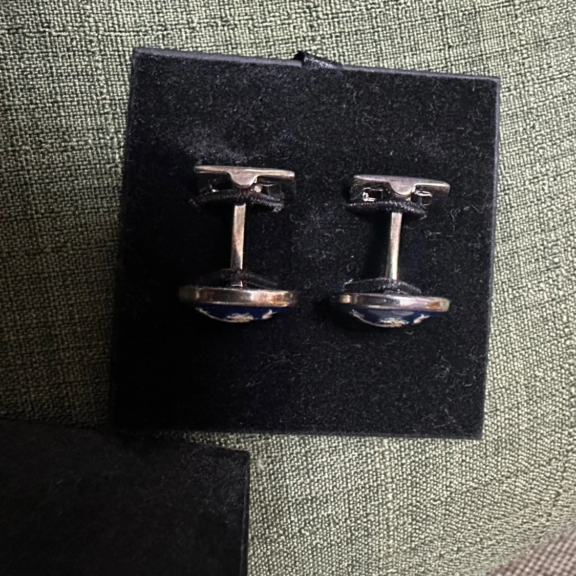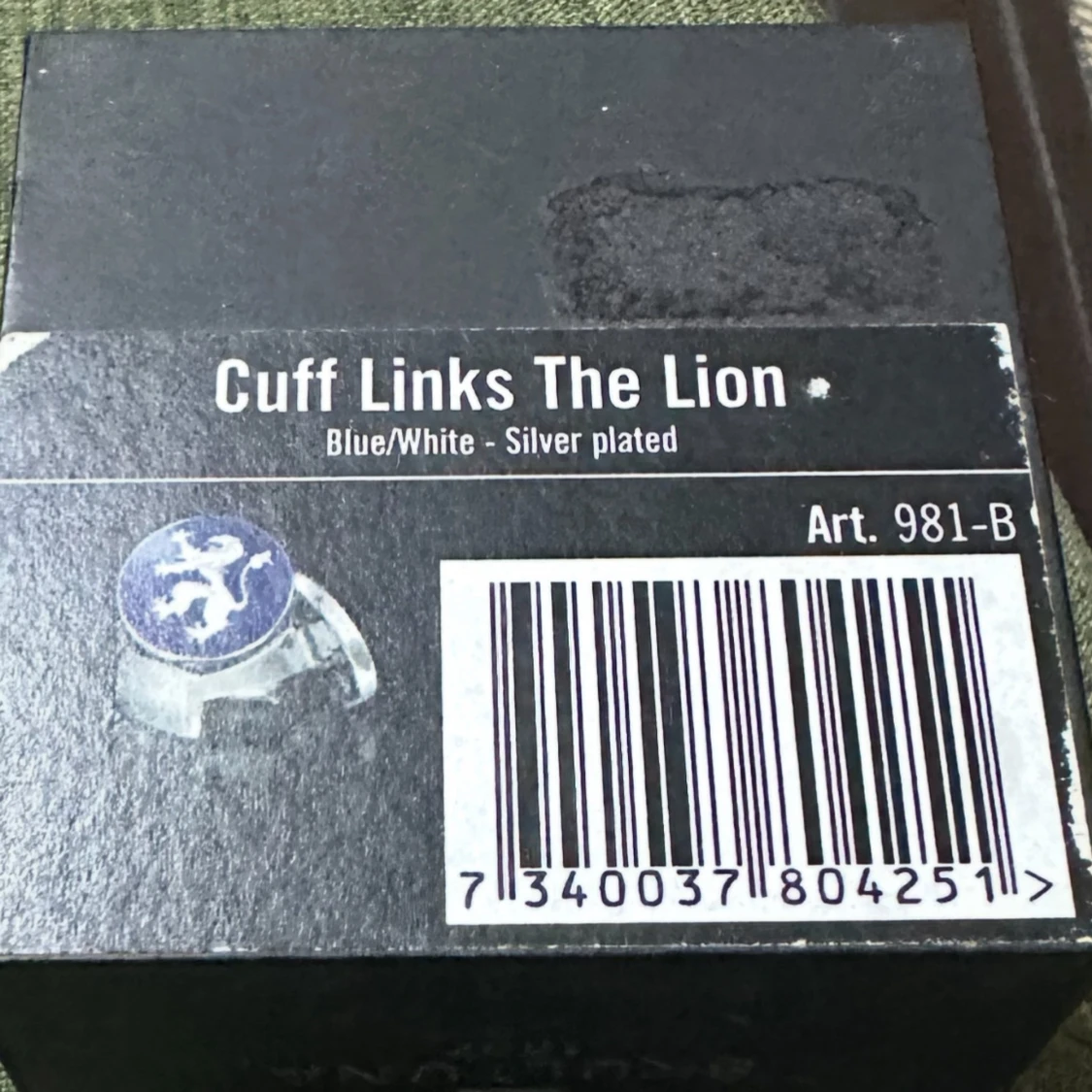 Snygga manschettknappar med blå bakgrund och ett vitt lejonmotiv. Runda och silverpläterade, perfekta för att ge skjortan en kunglig touch. Kommer i originalask med svensk kunglig hovleverantörslogga. Klassisk och stilren accessoar.