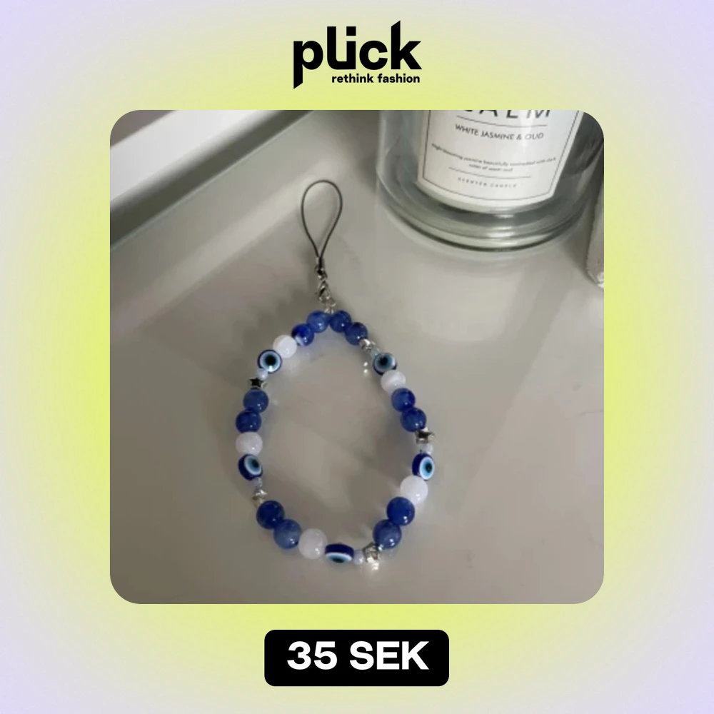 Säljer en coolt telefon accessoar med blå och vita pärlor och ögonmotiv. Perfekt för att ge en unik touch till din stil. Perfekt accessoar för både vardag och fest!