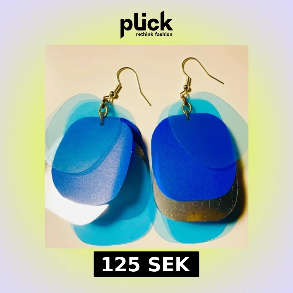 Unika statement örhängen med lager av blå och silverfärgade plastplattor i organiska former. Hängsmycket har transparenta och matta ytor som ger cool effekt. Perfekt för dig som vill sticka ut med färg och form. Krokar i metall.