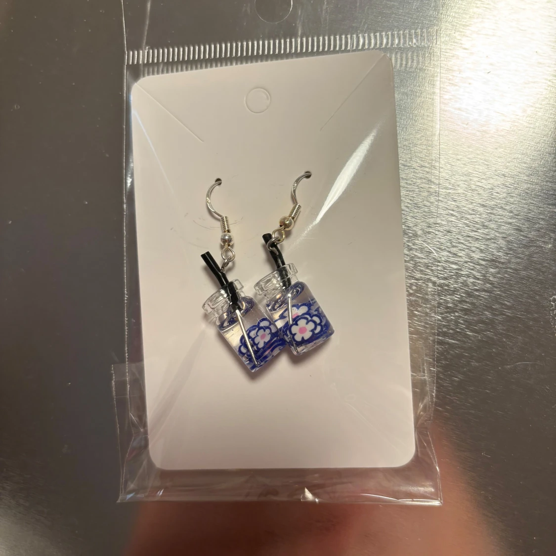 Charmiga örhängen formade som små dryckesglas med blått blommönster och sugrör. Perfekta för att ge en lekfull touch till din stil. (Billigt material)