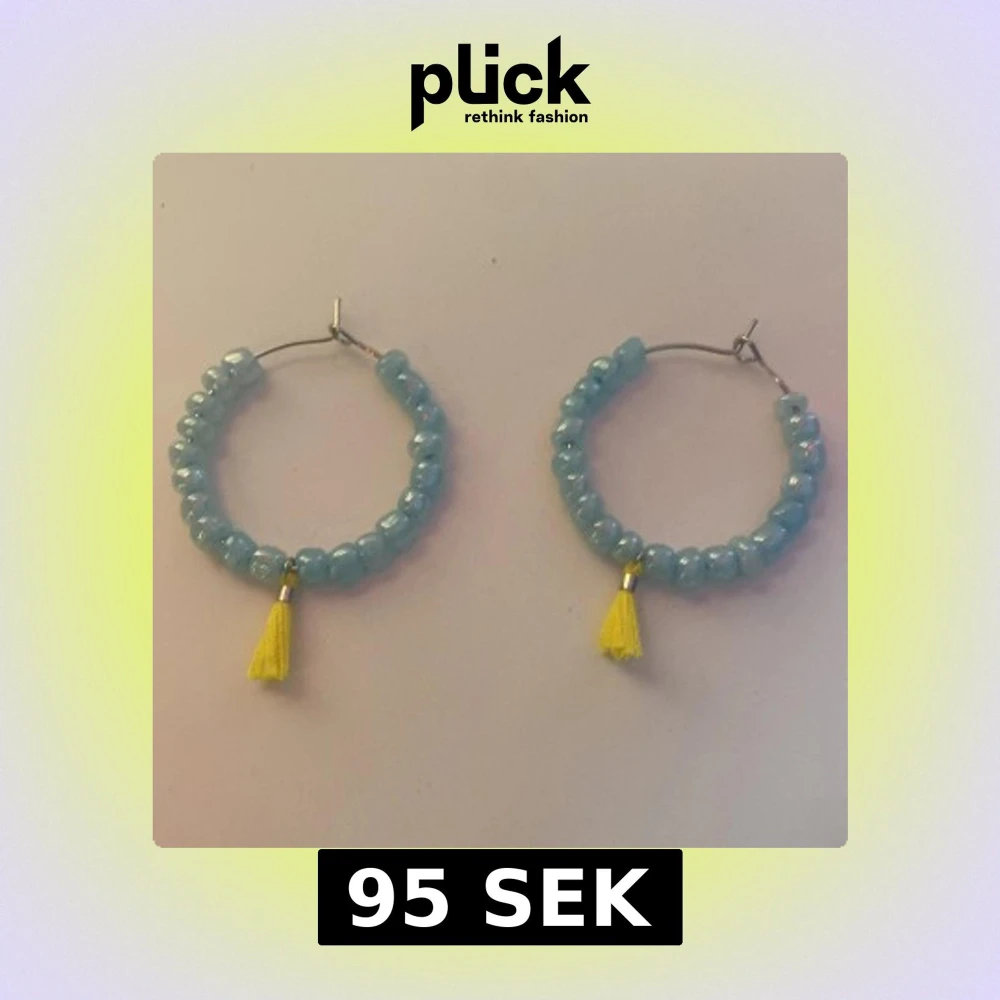 Säljer ett par runda örhängen med ljusblå pärlor och en liten gul tofs som hänger längst ner. Örhängena har en cool och lekfull vibe, perfekta för att ge din stil lite extra färg. Metallfäste och pärlor i plast. Superfina till sommarens outfits!