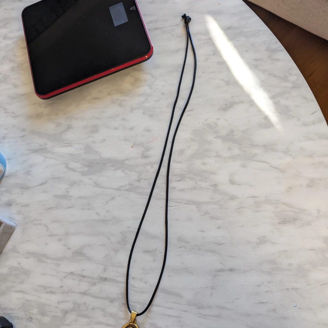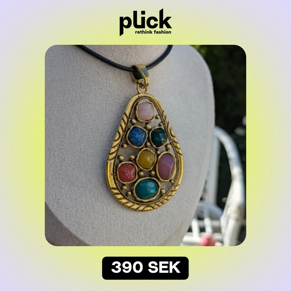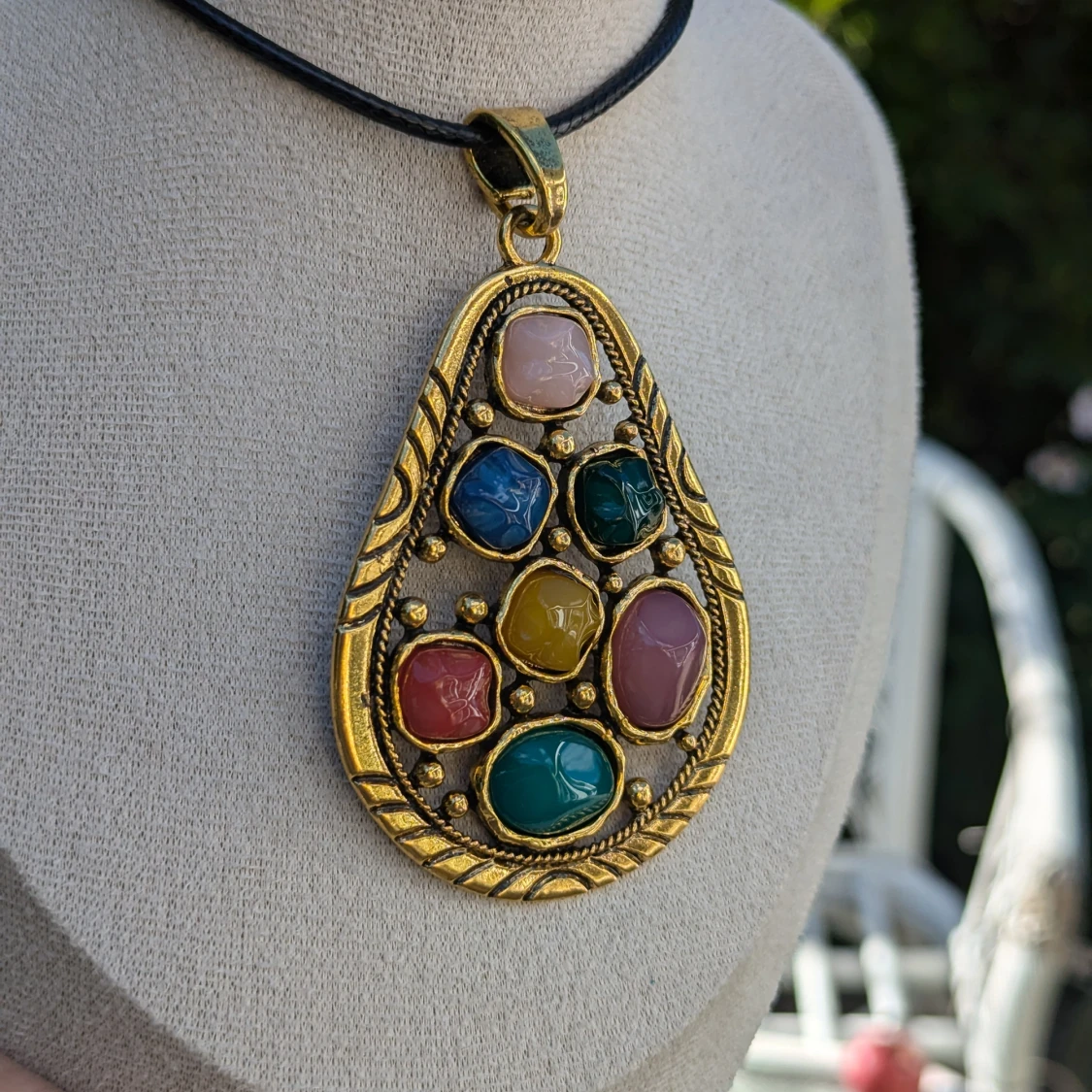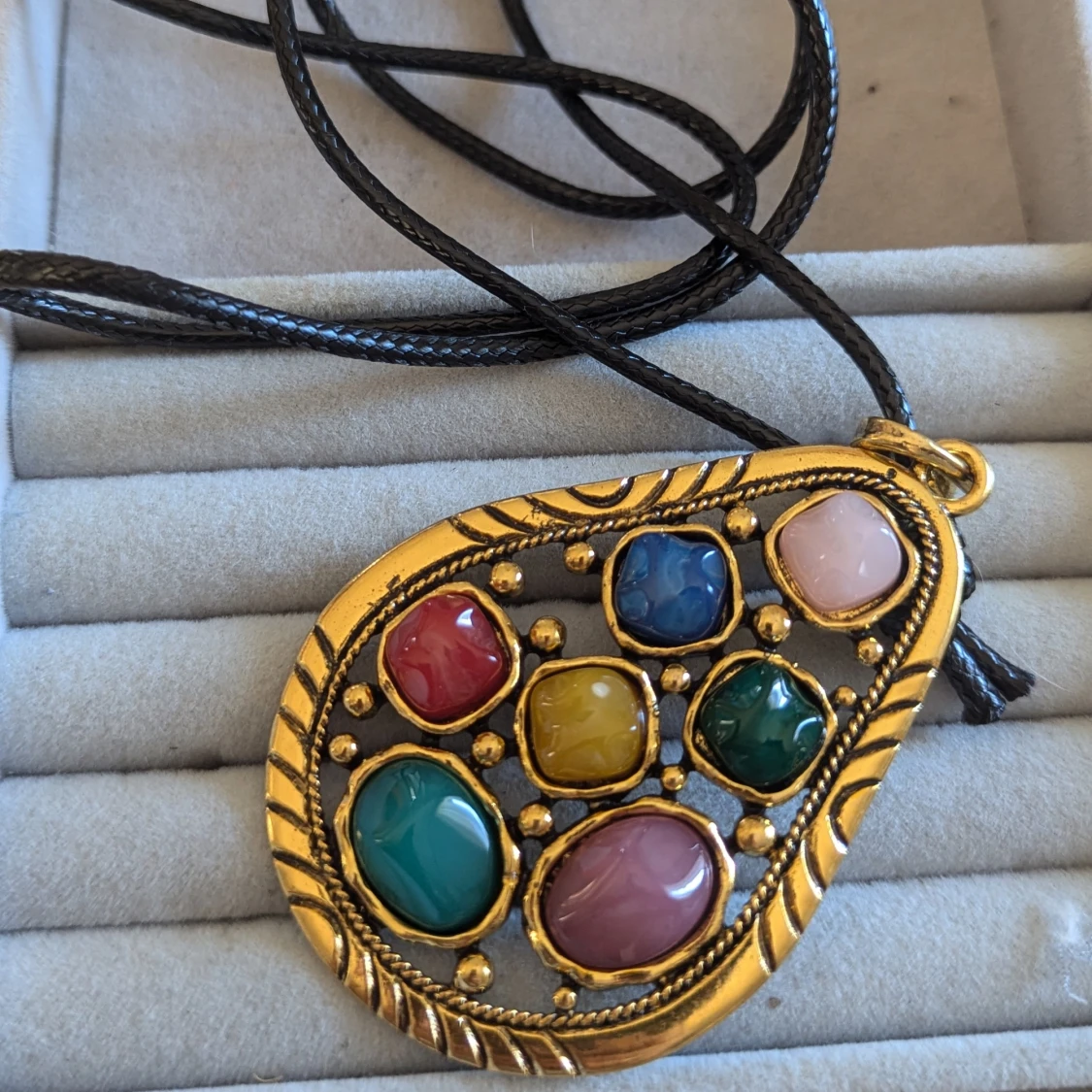 Säljer ett unikt halsband med en stor, droppformad hängsmycke i guld. Hängsmycket har flera färgglada stenar i rosa, blå, grön, gul och röd. Kedjan är en enkel svart snodd med justerbar knut.nya