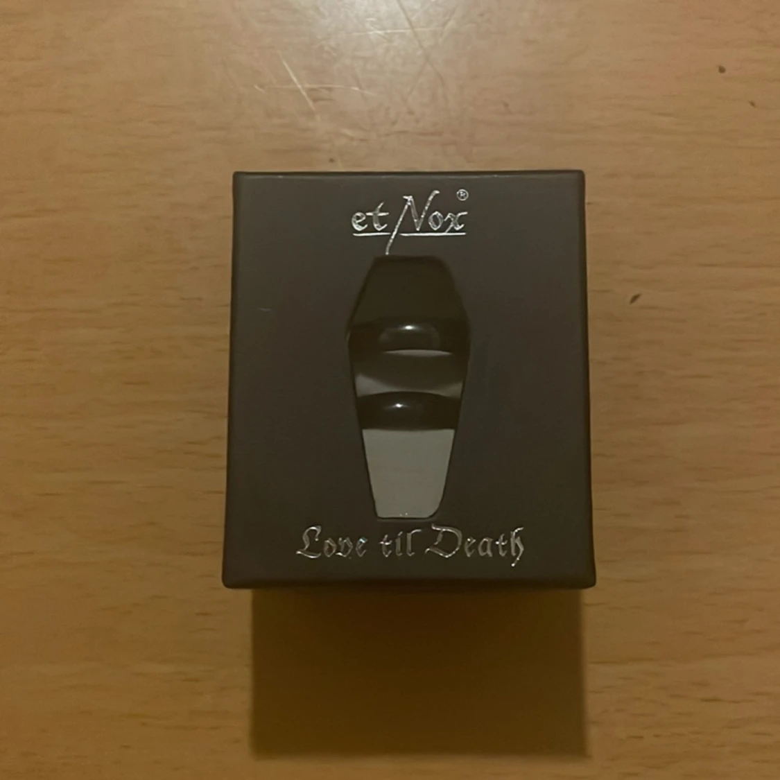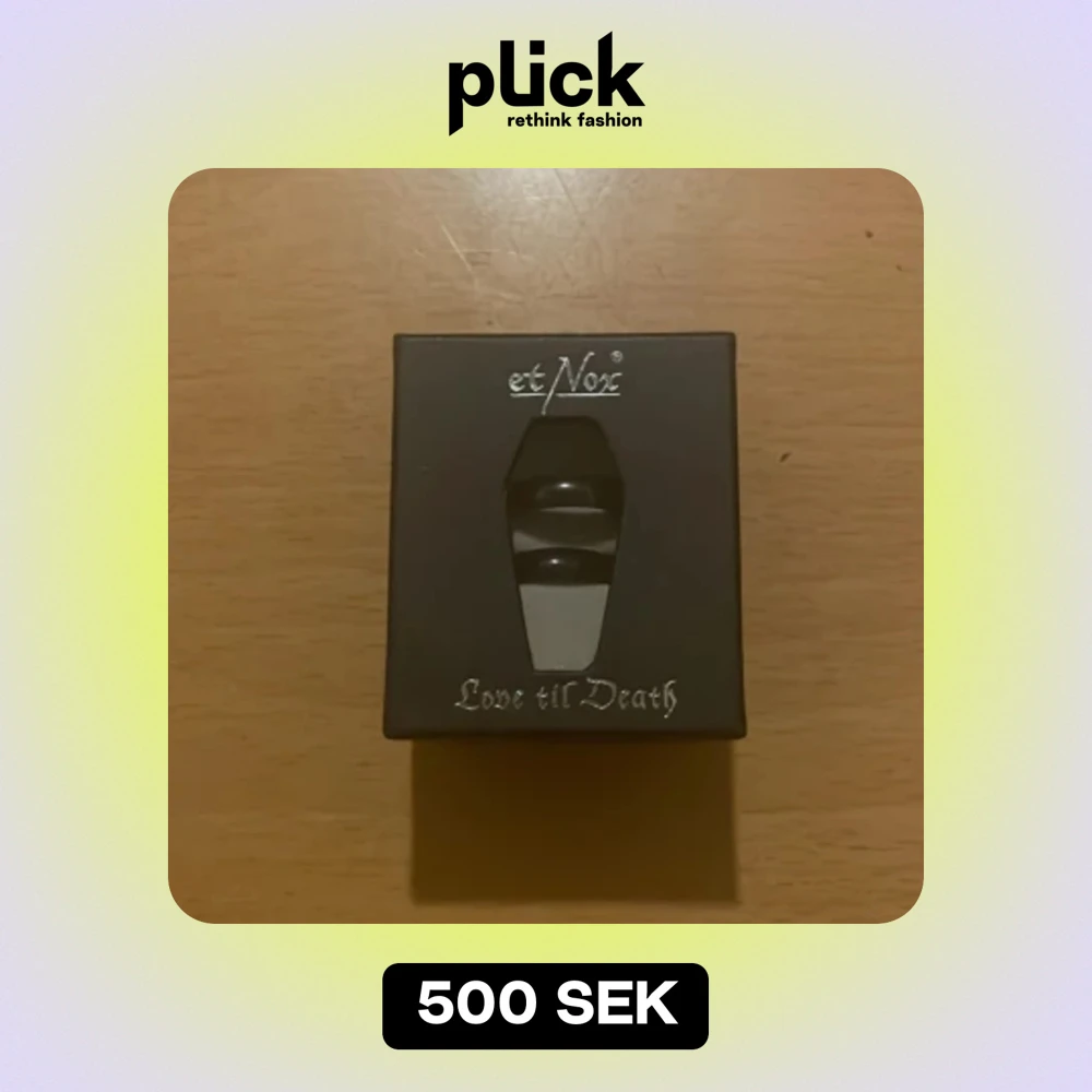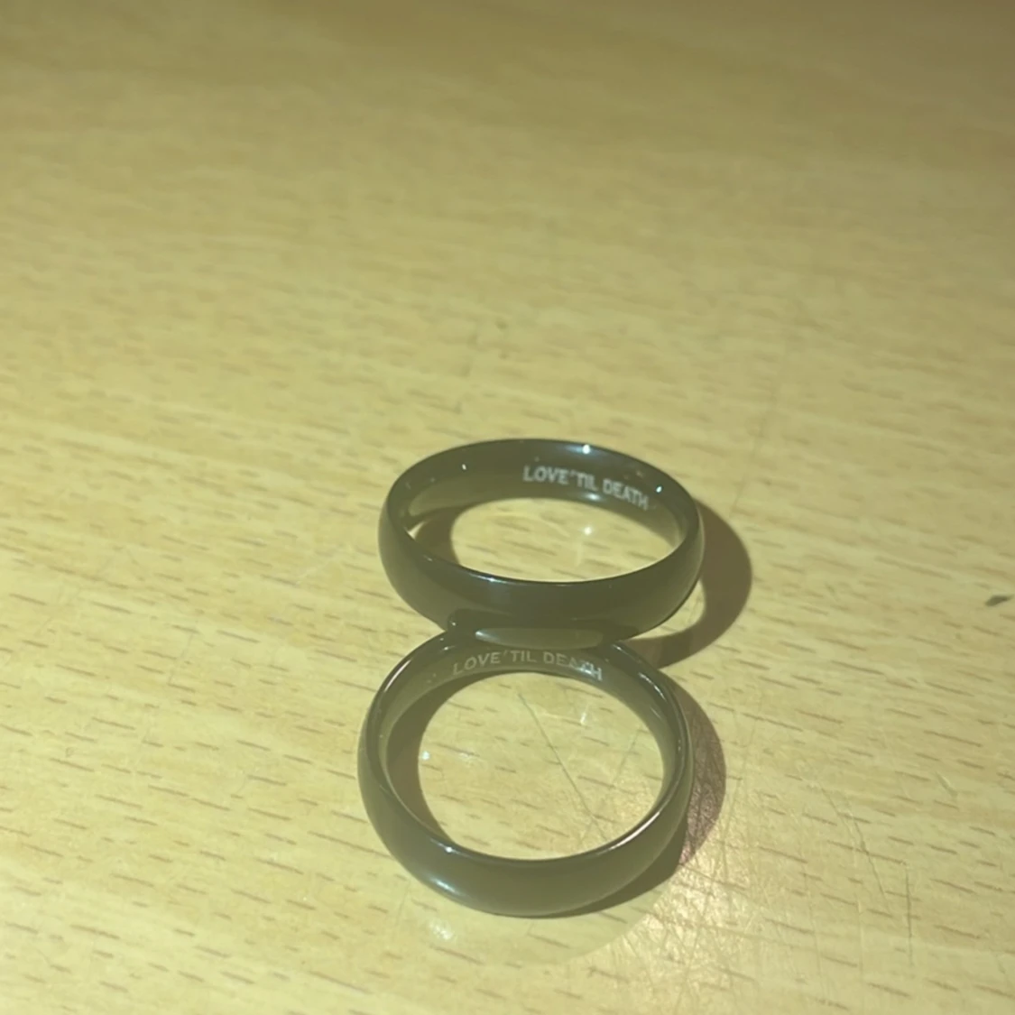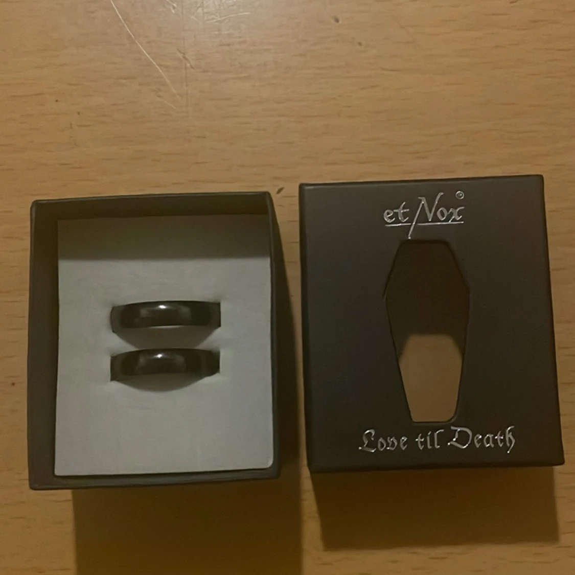 Två jättefina svarta ringar med texten ”love til death” i båda. Kommer i en fin förpackning. Säljer då den ej passade min kille. Den ena ringen är större än den andra då den är tänkt till en man och en kvinna. En jättesöt present till sin partner. 🌺