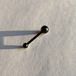 Svart tungpiercing i rostfritt stål. Den övre kulan är större än den undre. Använd 1 gång. (Kommer helt nytvättad) betalning sker över swish (köpare står för frakt)