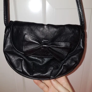 Skitsnygg svart väska med en rosett. Väldigt lång (axelbandetbandet ca. 60 cm) men praktisk pga hur liten den är!