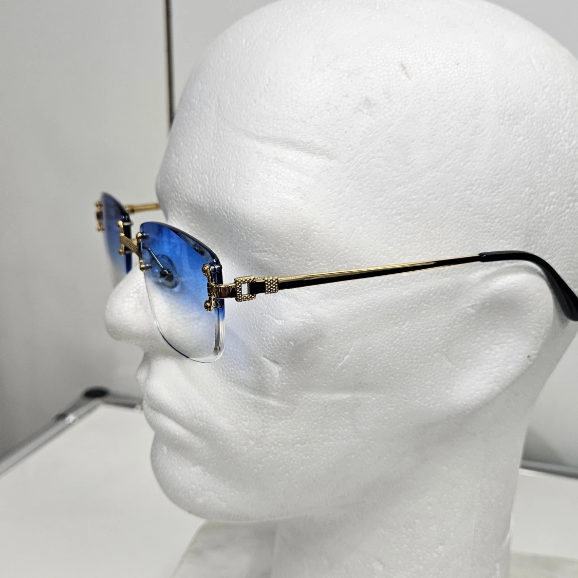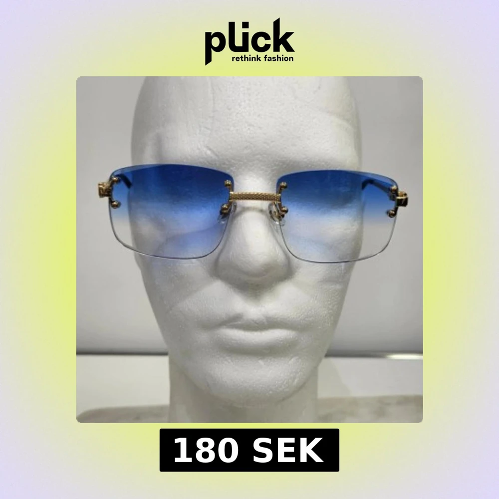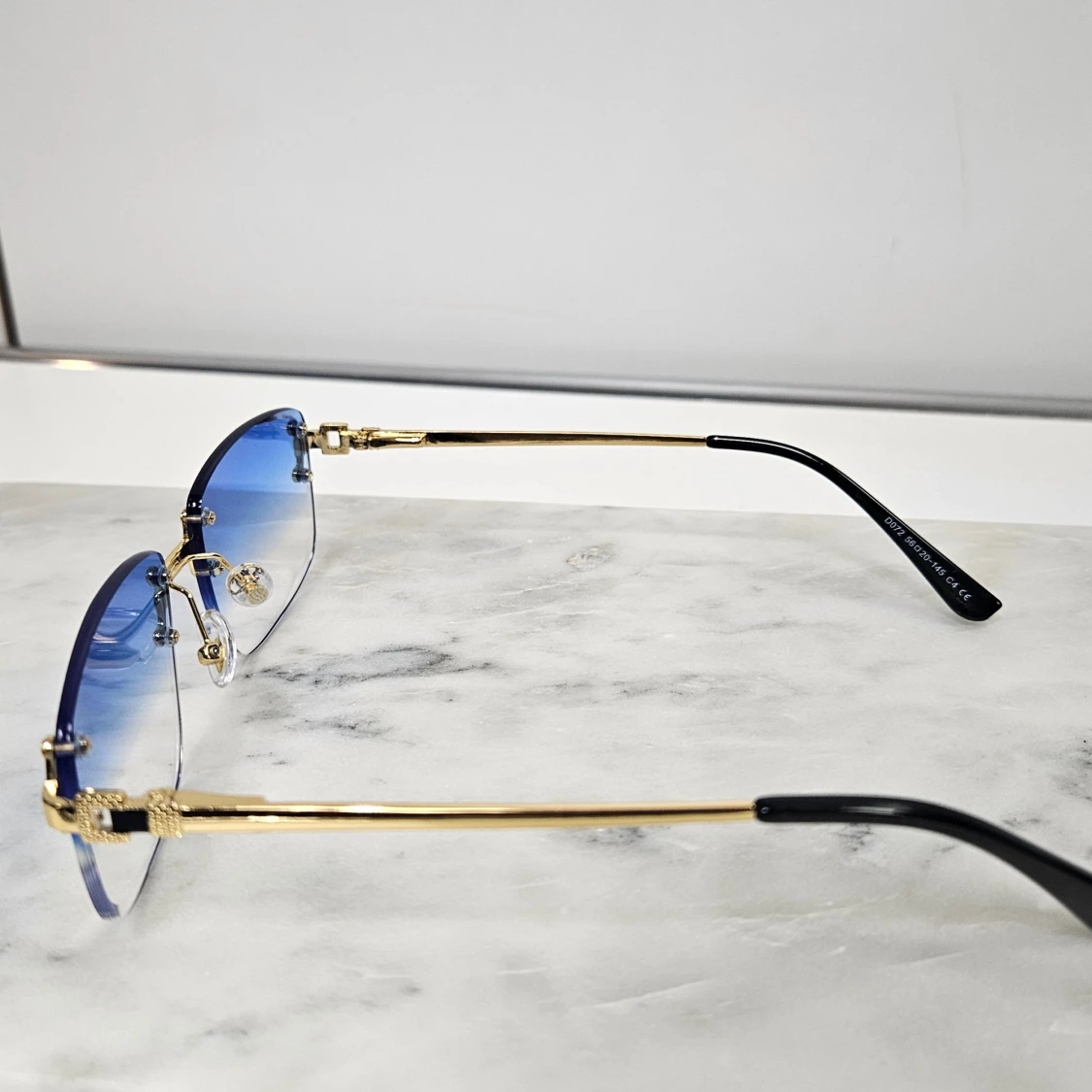 Snygga solglasögon med rektangulära blåtonade glas och guldfärgade metallbågar. Glasen är utan ram och har en gradient från blått till transparent. Näskuddar och tunna skalmar i guld med svarta ändar ger en exklusiv känsla. Linsfärg: Blå Ram i guld av metalllegering UV400-skydd Nya solglasögon