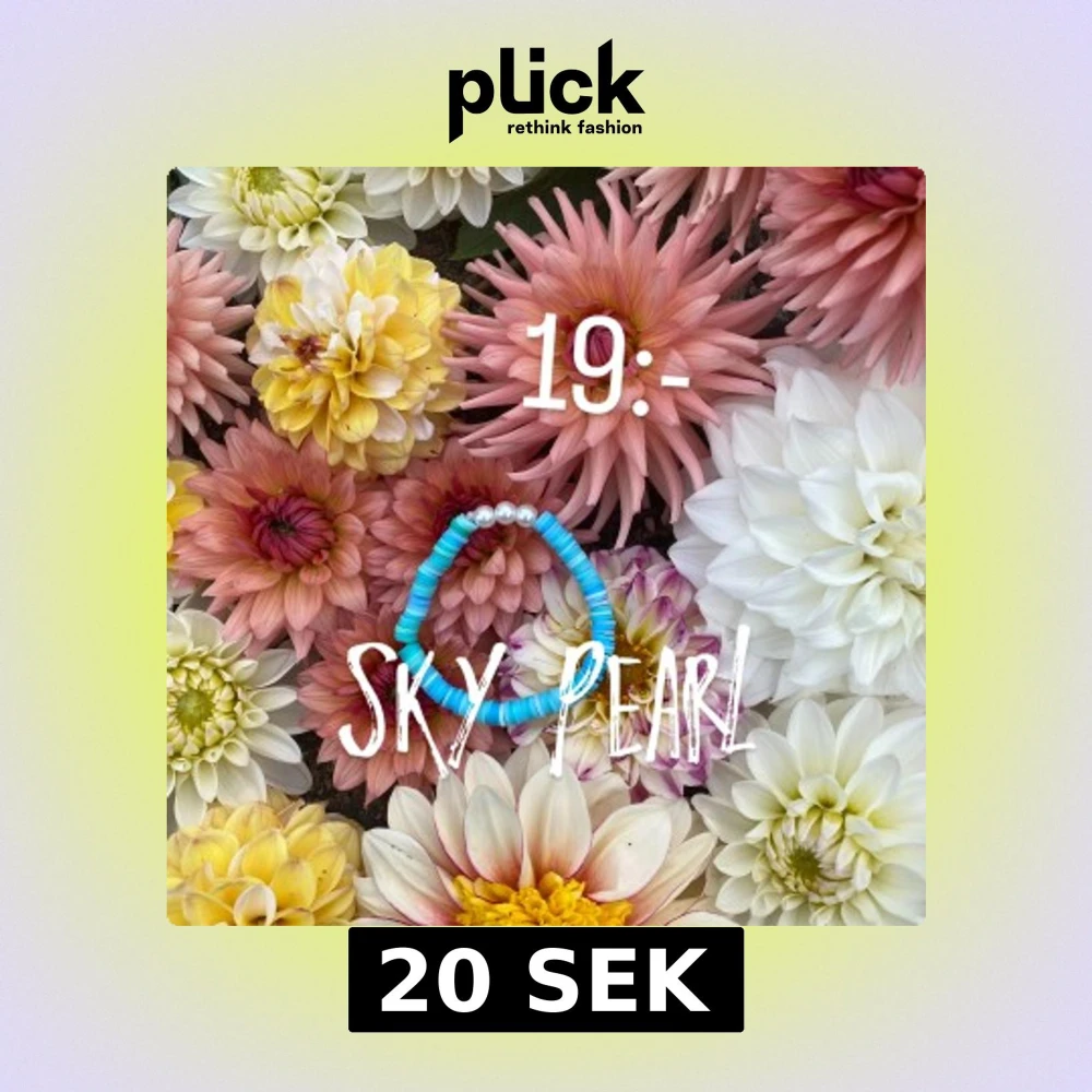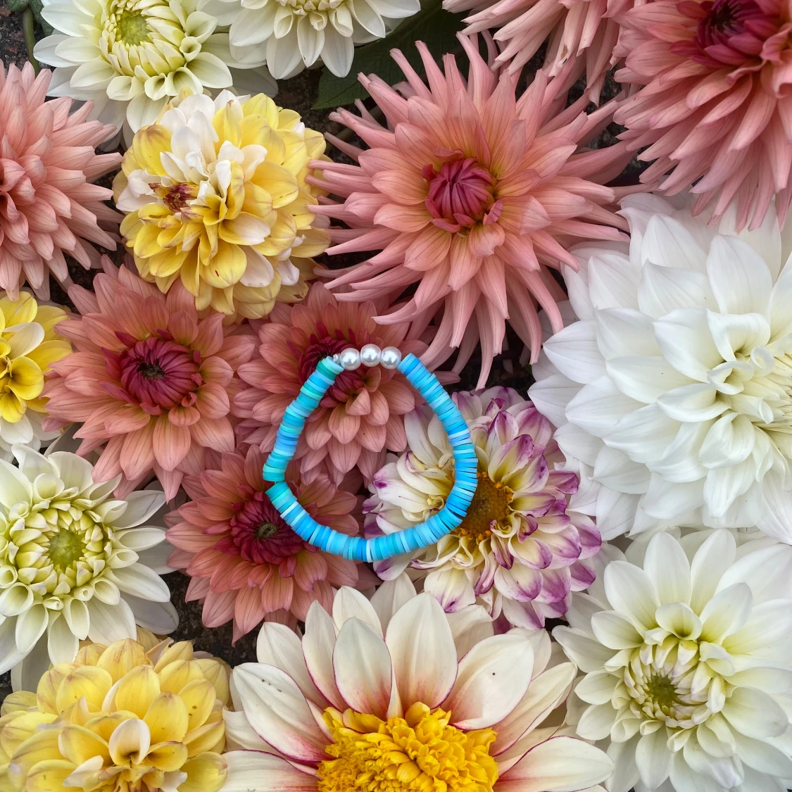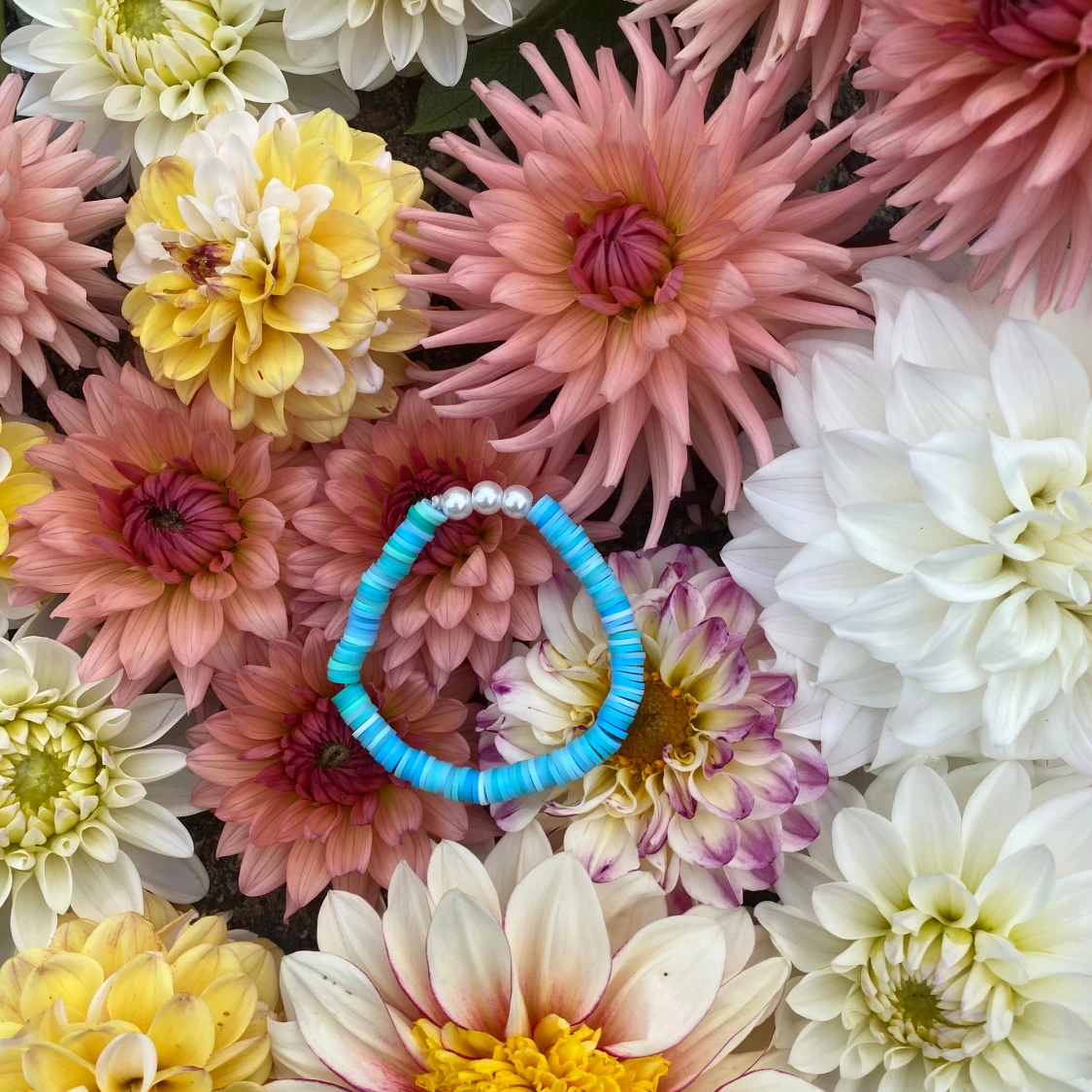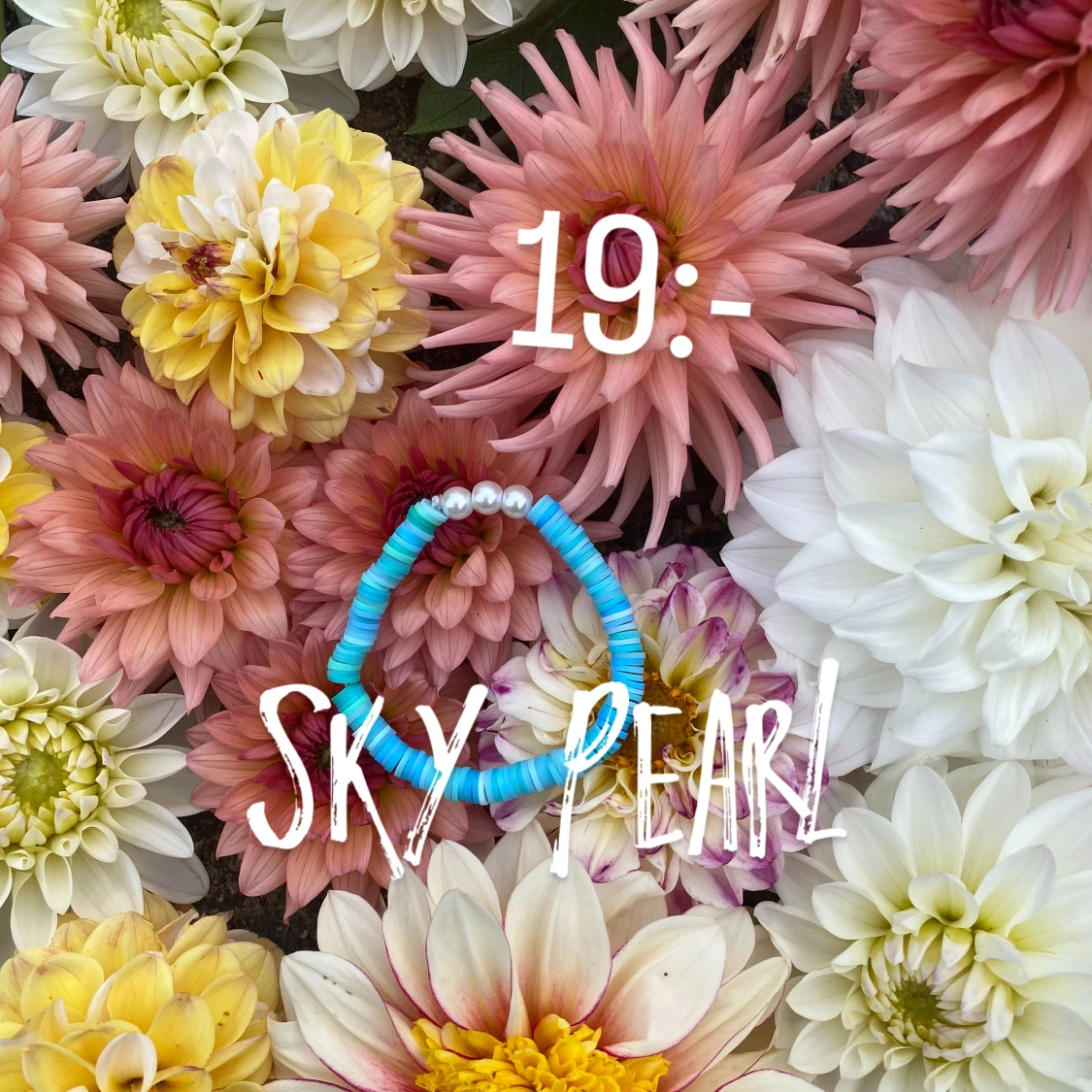 Armband med turkosblå platta pärlor och tre vita runda pärlor som accent. Färgglad och somrig design som sticker ut på handleden. Perfekt accessoar för dig som gillar färg och vill ha något unikt.