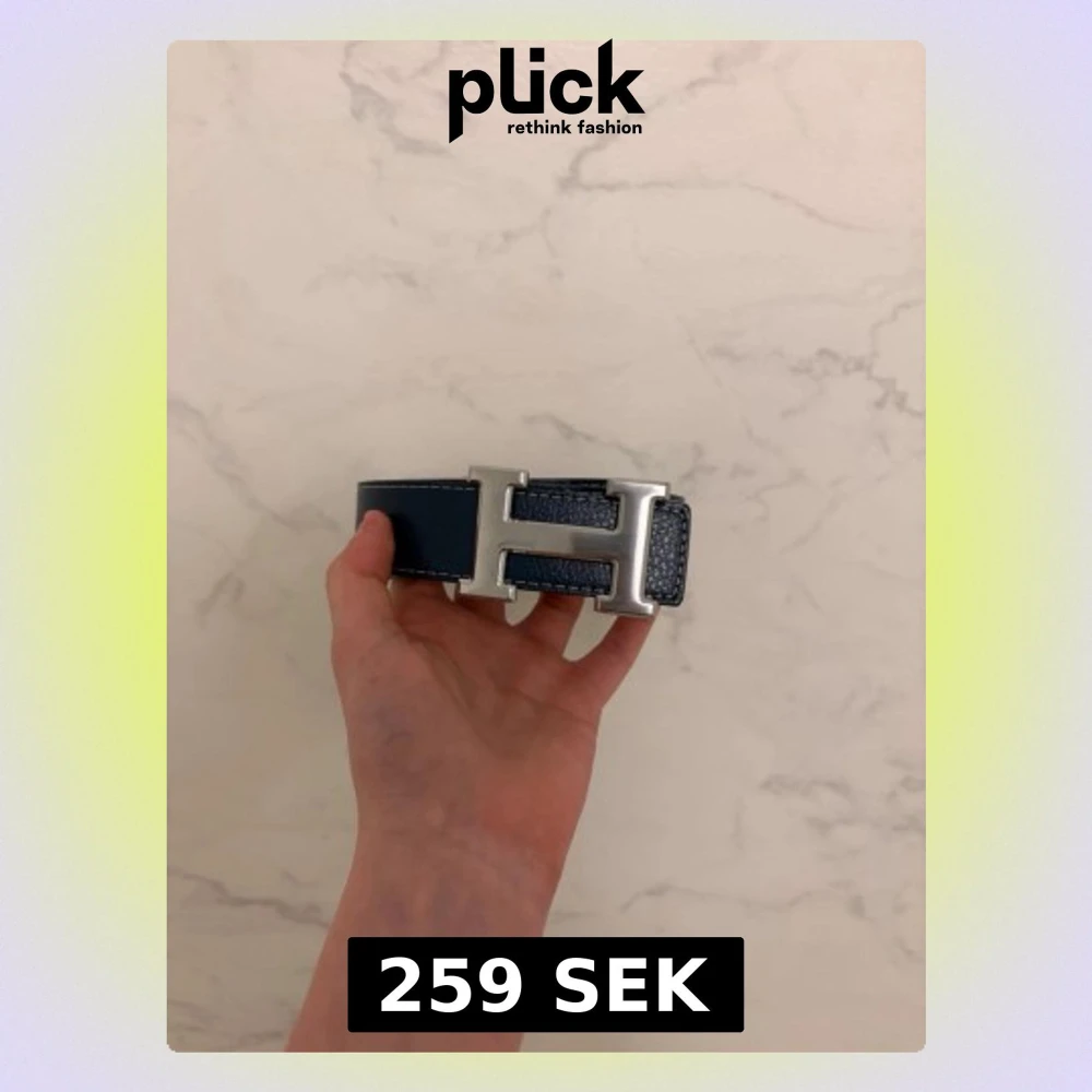 Säljer ett stilrent blått bälte med ett stort H-format spänne i silverfärg. Bältet har vit kontrastsöm längs kanterna och är gjort i ett slätt material som ger en clean look. Perfekt accessoar för att lyfta jeans eller byxor.
