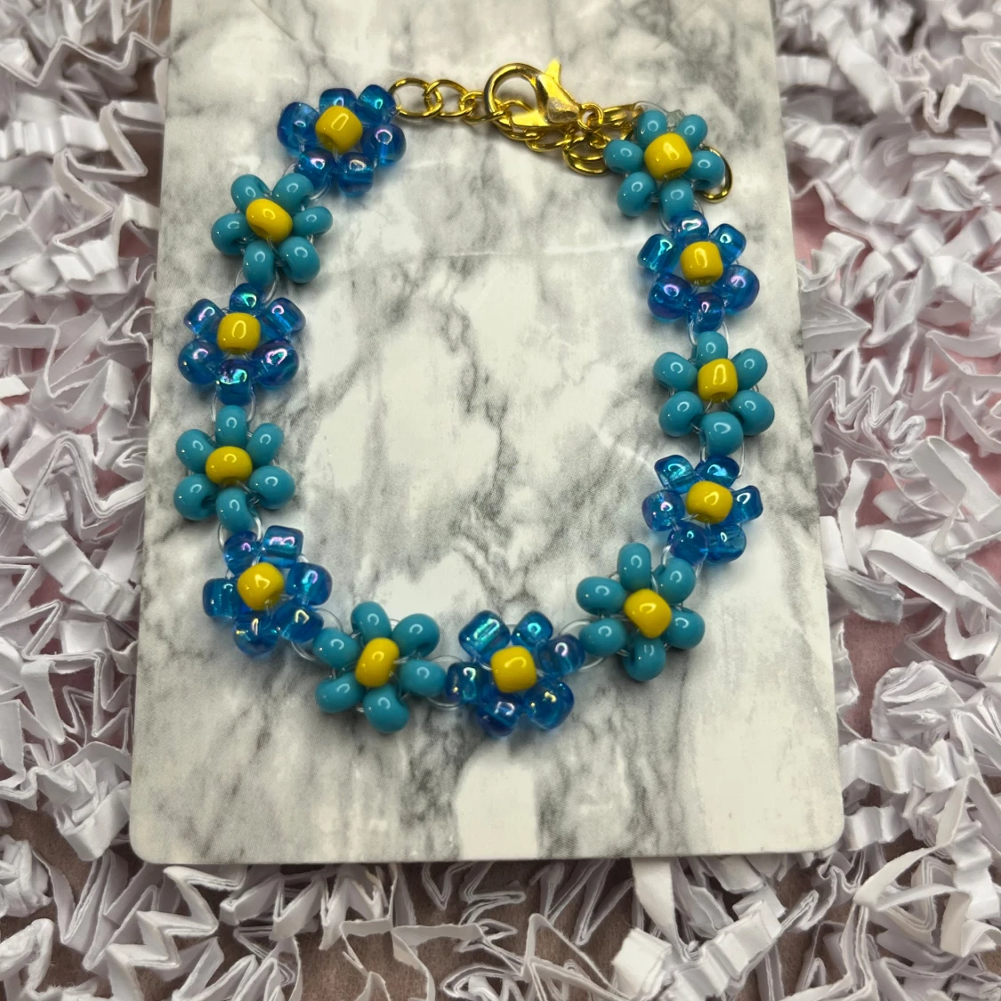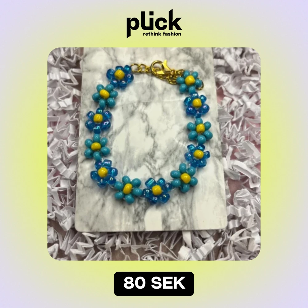 Blått blomarmband, som går att justera. För mer bilder och information, skriv till mig.