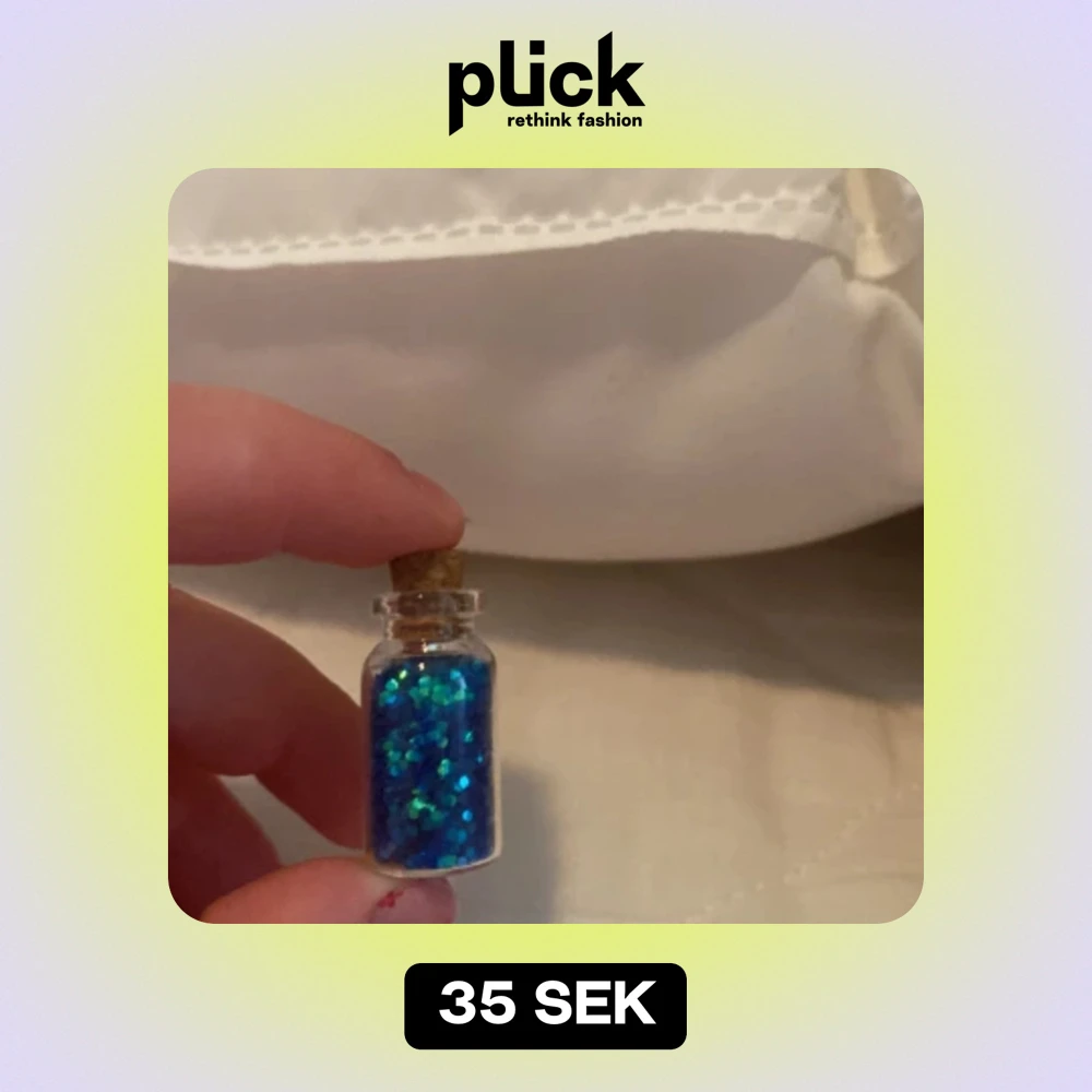 Ett halsband med en liten glasflaska fylld med blått glitter och en kork. Flaskan hänger i en kedja och fungerar som ett unikt smycke.
