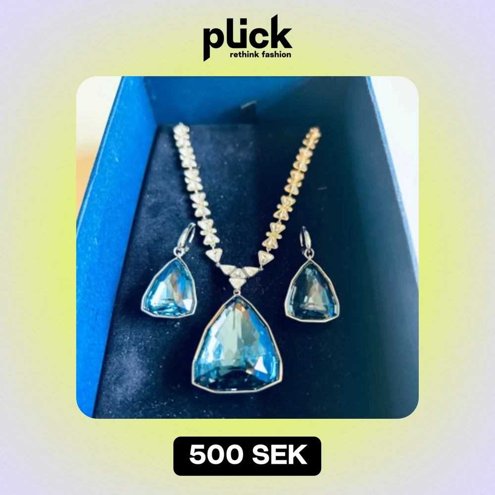 Säljer ett elegant smyckeset från Swarovski med ett halsband och matchande örhängen. Båda har stora, blå kristaller som verkligen fångar ljuset. Halsbandet har en kedja med små, glittrande detaljer och ett säkert lås. Perfekt för speciella tillfällen eller som en lyxig present!