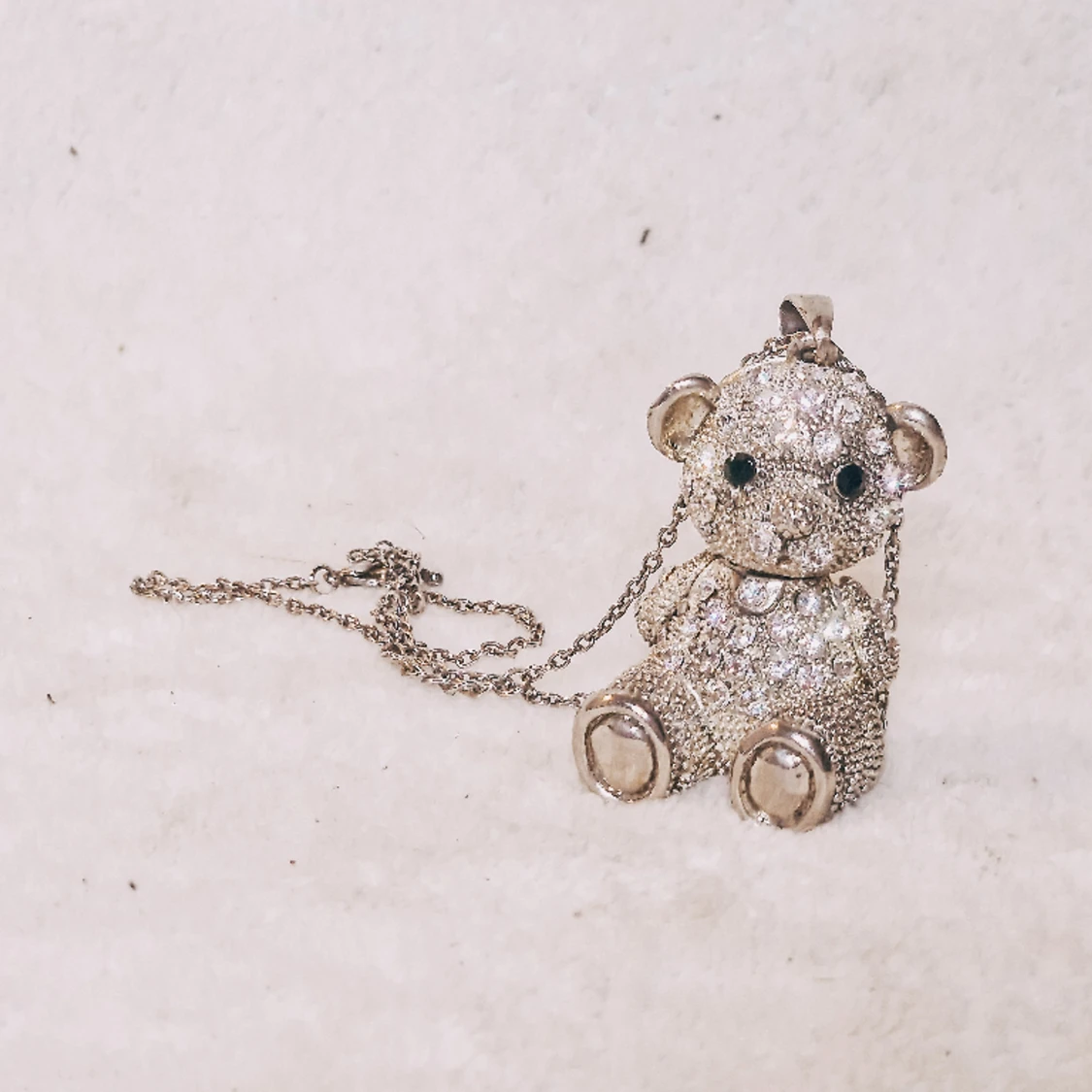 Silvrigt halsband. Stor nalle med bling som kan vända på huvudet. I superskick och helt unikt! Ger Y2K-vibbar. Använd gärna köp-knappen 💖💖 & följ min profil för fler nyheter! 🥰
