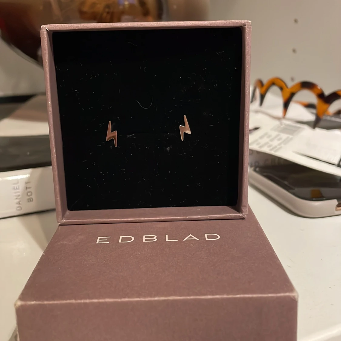 Säljer ett par coola blixtformade örhängen från Edblad. De är i silverfärg och kommer i en snygg rosa ask. Perfekta för att ge din outfit en edgy touch! 💥