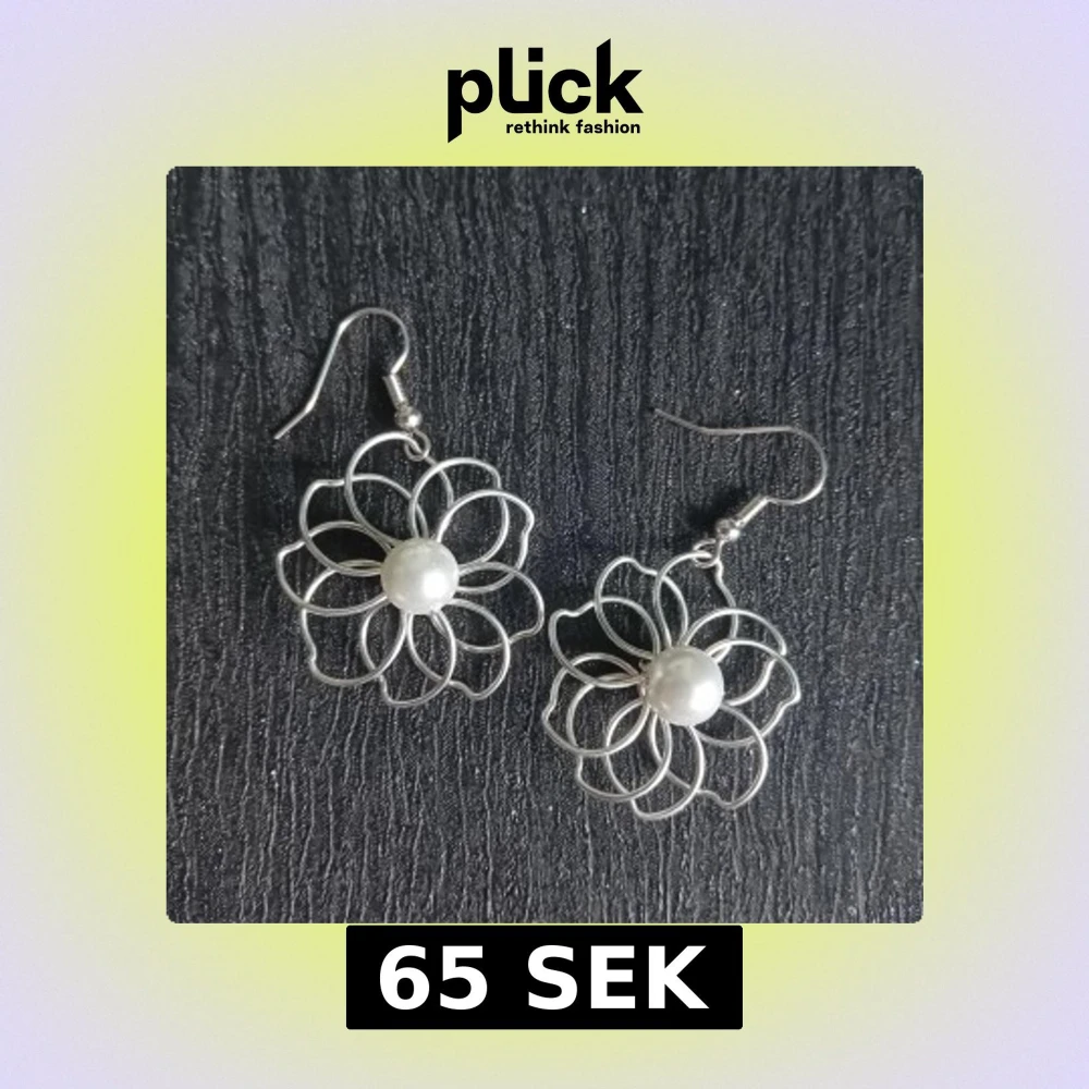 Egentillverkade örhängen i form av blommor gjord med silverfärfade metalltrådar och en vit pärla i mitten. Perfekta för dig som vill ha något annorlunda och stilrent som sticker ut. Blomman är ca 3cm stor