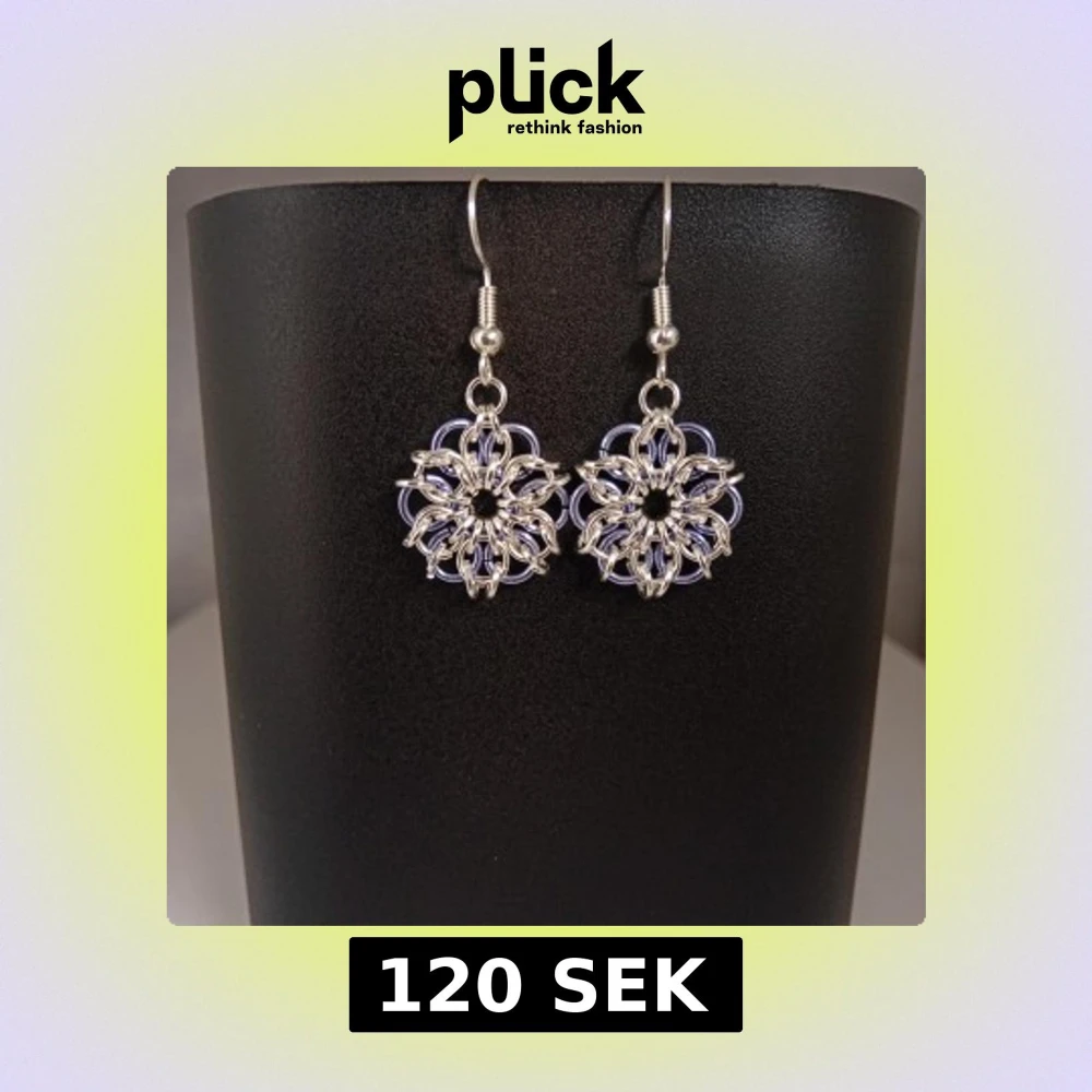 Egentillverkade örhängen gjorda med bindringar i silverfärg och blå nyans. Öronkroken är nickelsäker och aldrig använda. Längd ca 3cm långa, blomman är ca 2 cm