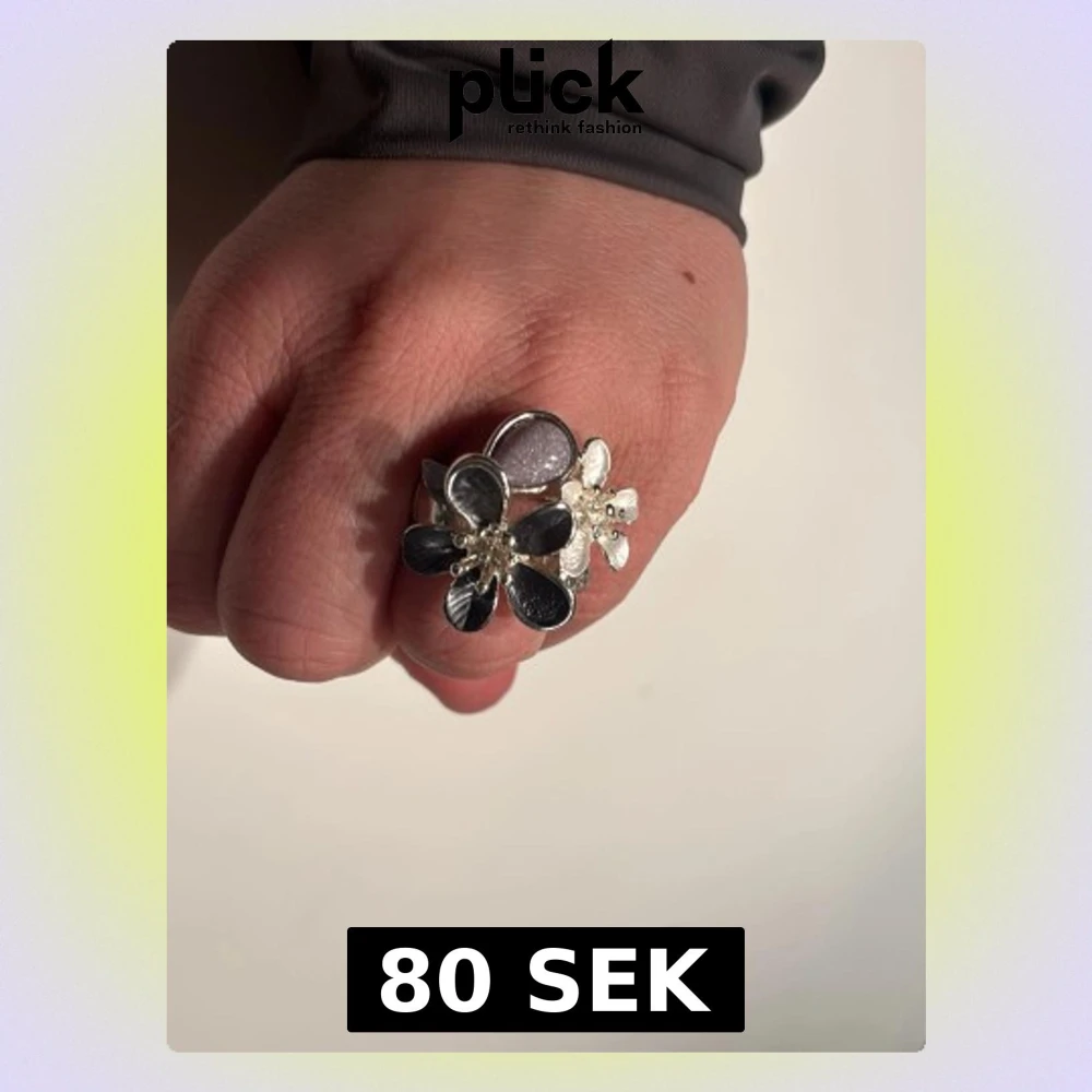 Snygg och chunky ring i silverfärgad metall med två blommor framtill, en med gråa blad och en med silvriga blad. Blommorna har glittriga detaljer i mitten och ringen har en bred, blank ringbas. Perfekt statement piece för dig som gillar att sticka ut.