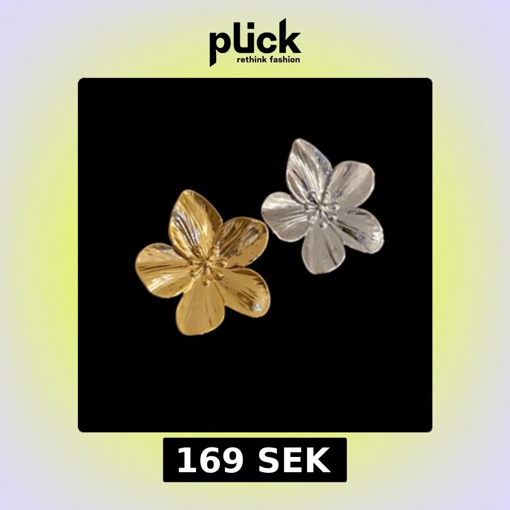 Säljer ett par ringar formade som blommor, ena i guld och andra i silver. De har fem kronblad med detaljerade linjer som ger en cool 3D-effekt. Perfekt för dig som vill sticka ut med ett unikt och trendigt smycke.