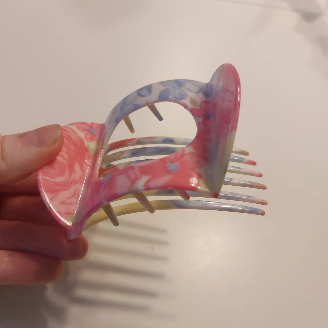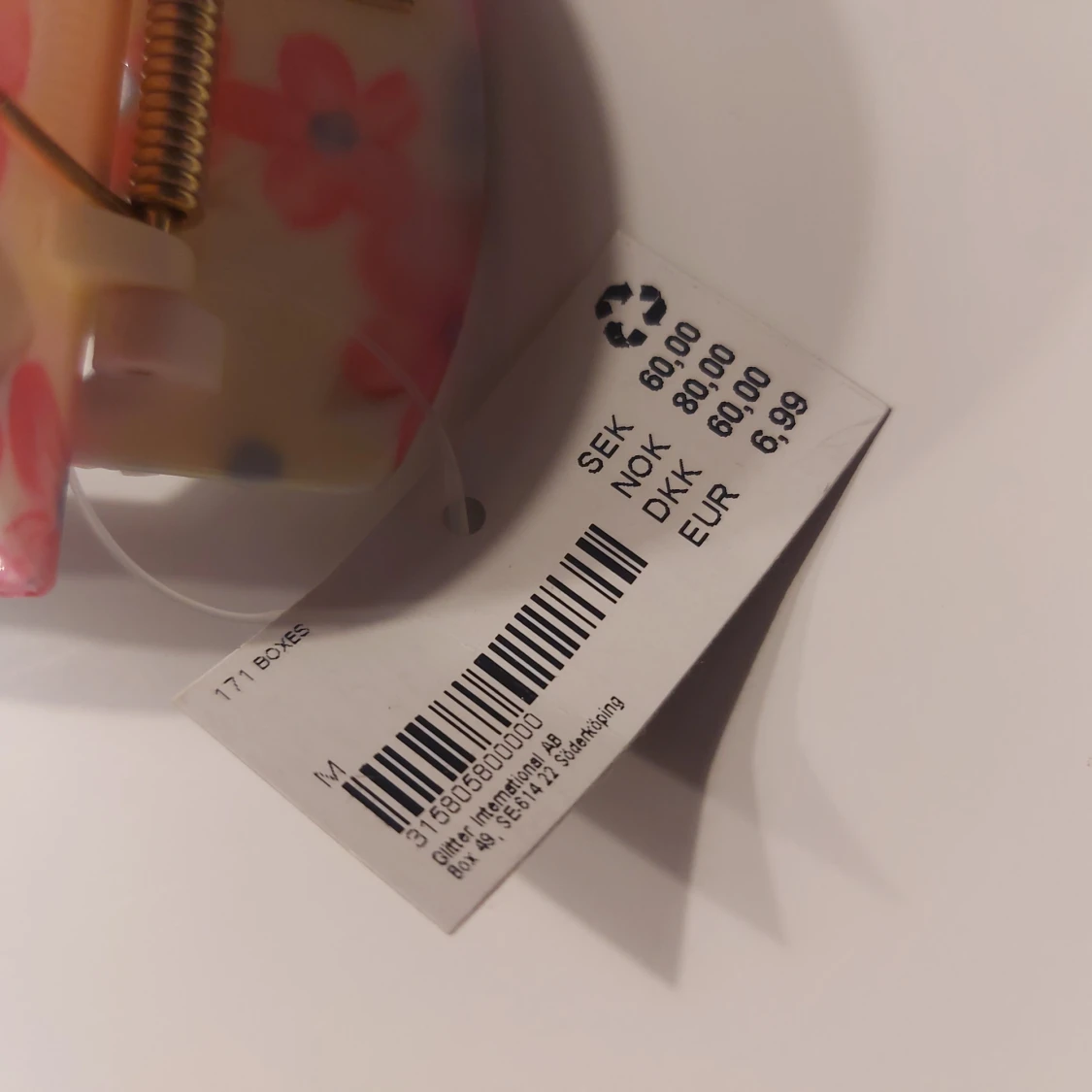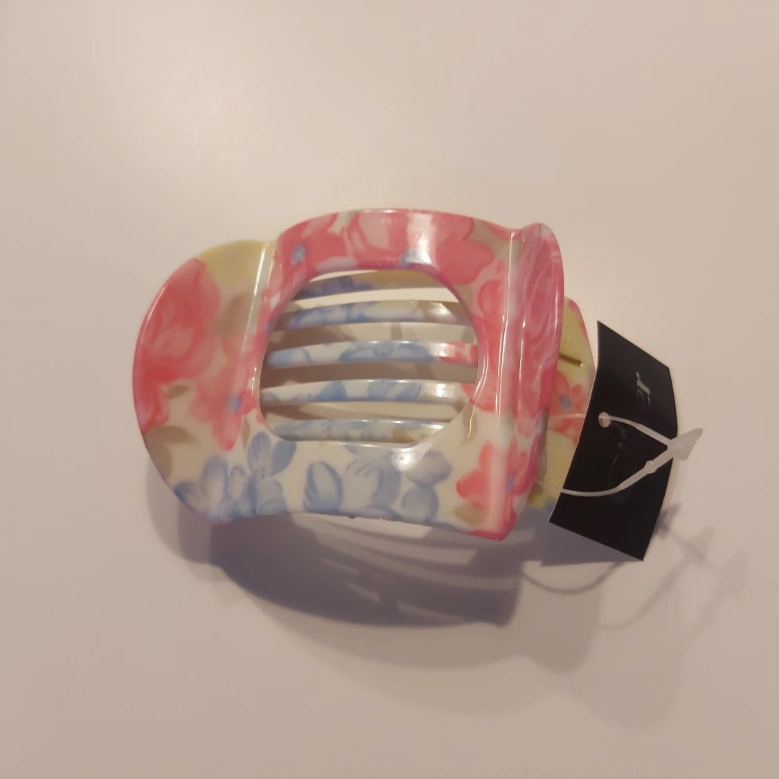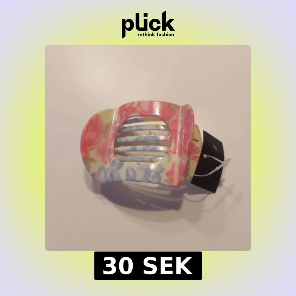 Snygg hårklämma med blommigt mönster i rosa, blått och vitt. Perfekt för att hålla håret på plats med stil. Klämman har en stabil fjädermekanism och är lätt att använda. Med prislappen fortfarande på! Skriv om ni har någon fundering!✨️