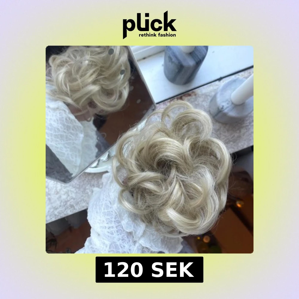 Säljer en blond hårscrunchie med lockigt syntethår, perfekt för att snabbt fixa en voluminös och snygg uppsättning. Ger en naturlig look med sina mjuka, blonda lockar och är enkel att använda för att skapa en festlig frisyr. Oanvänd!