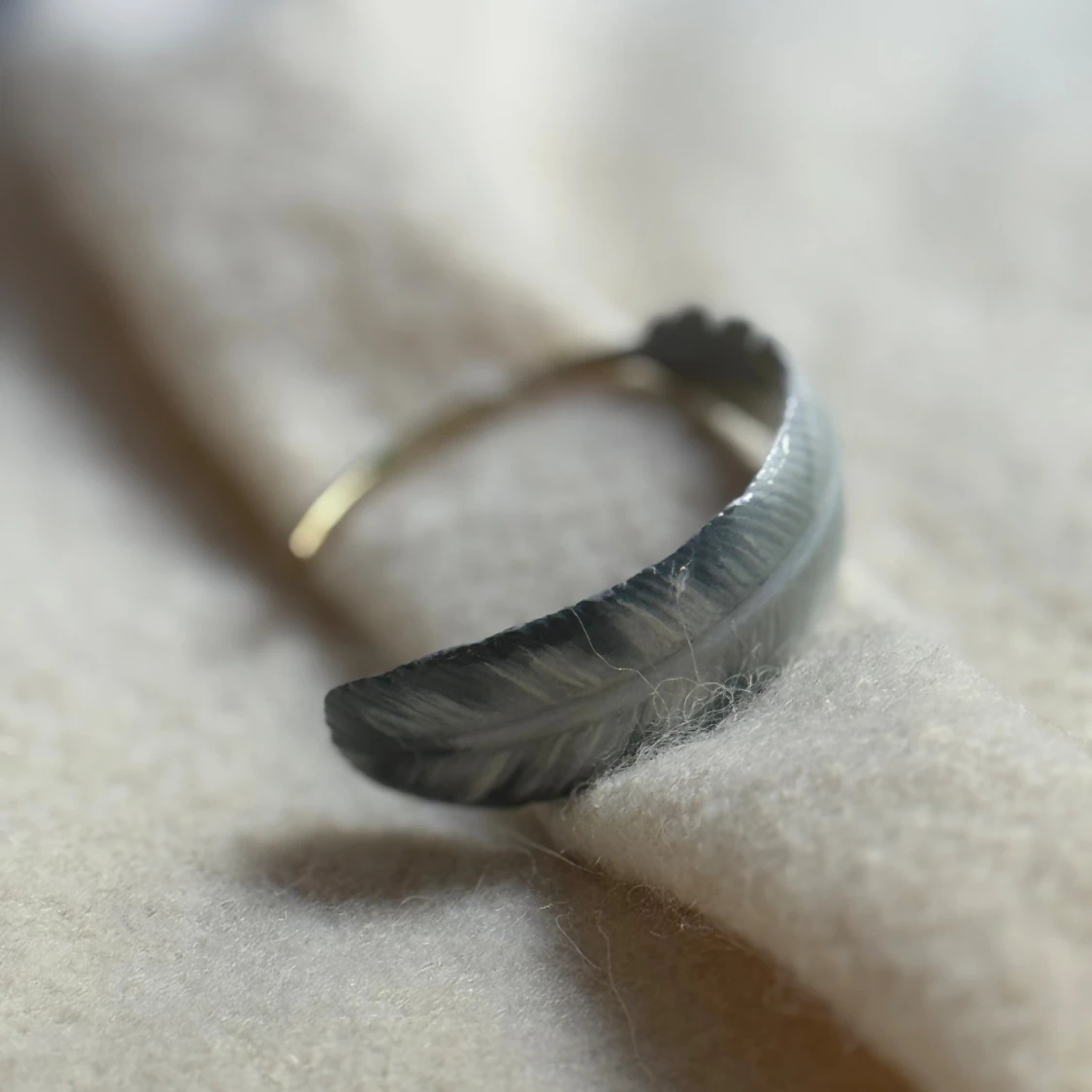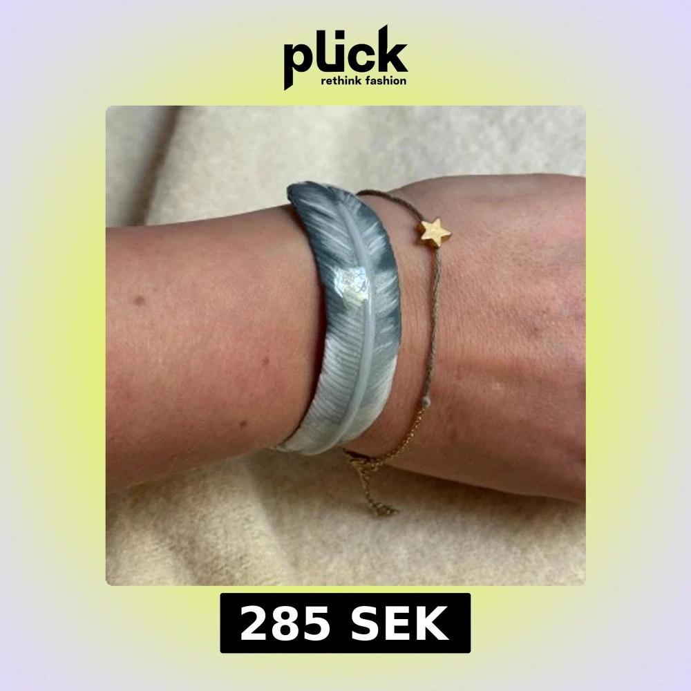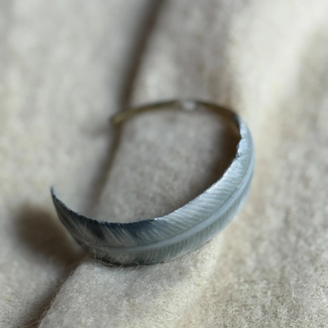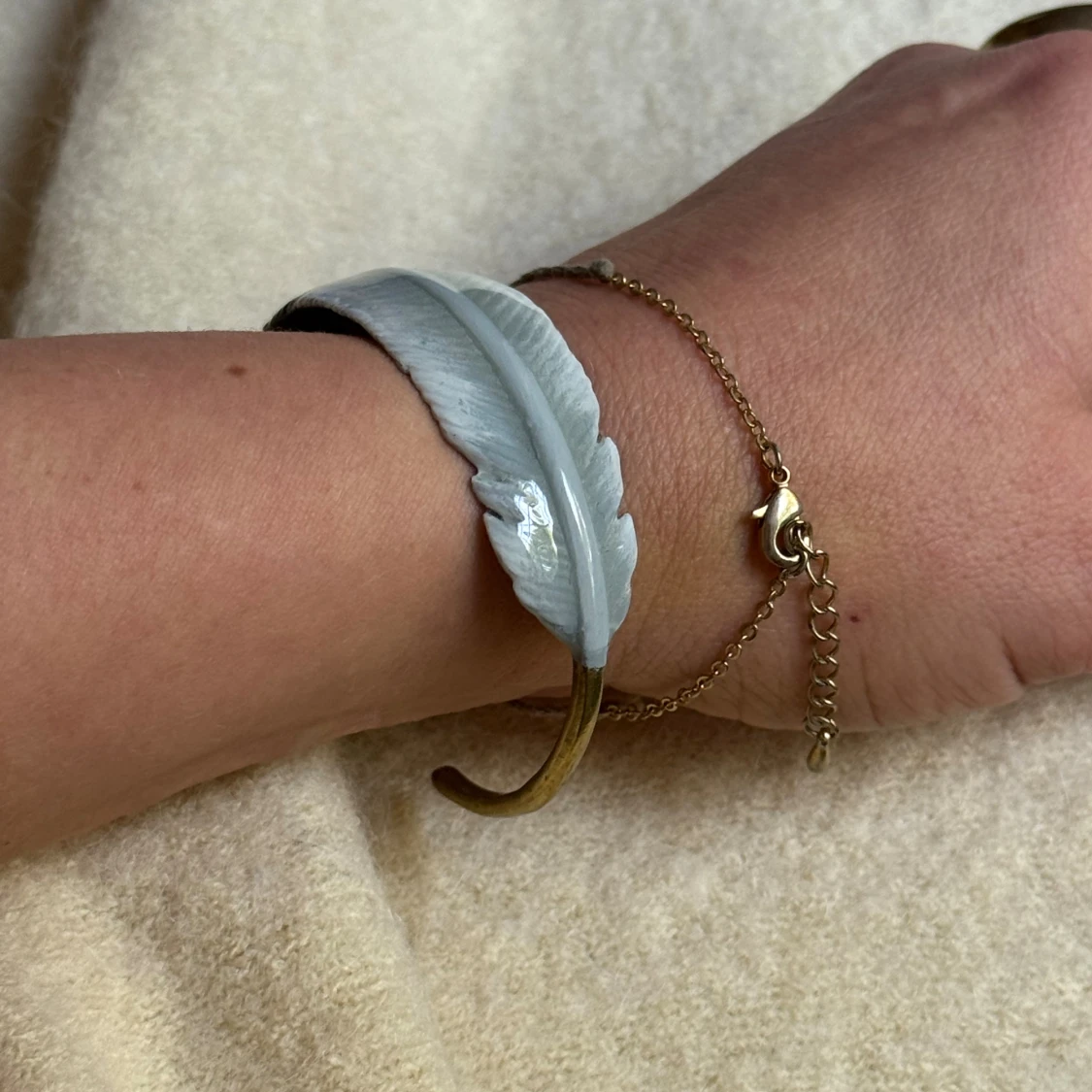 Mässingsarmband i metall med en snygg fjäderformad design i grå och silvertoner. Fjädern har detaljerade linjer som ger ett naturtroget och coolt intryck. Perfekt för dig som gillar boho eller vill ha något annorlunda på handleden.