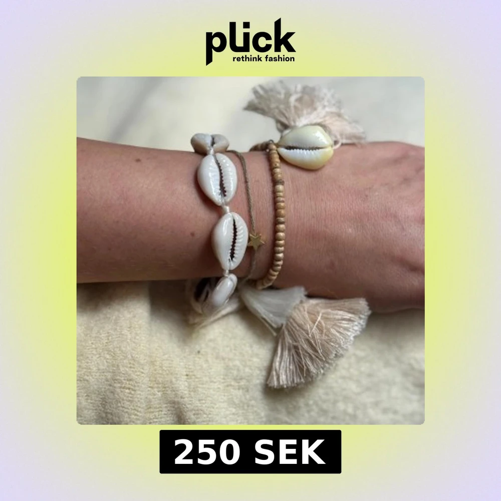 Säljer ett set med 2 armband i avslappna boho-stil, dekorerade med vita snäckor, små träpärlor och stora tofsar i ljusbeige. Armbanden har även en liten i guldton och är perfekta för en somrig look. Reglerbar storlek.
