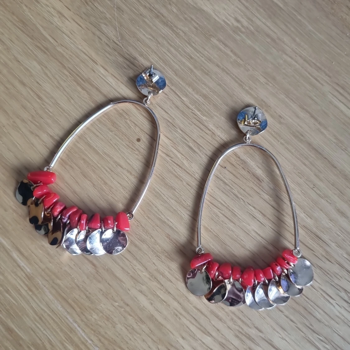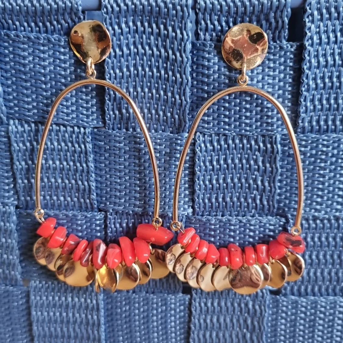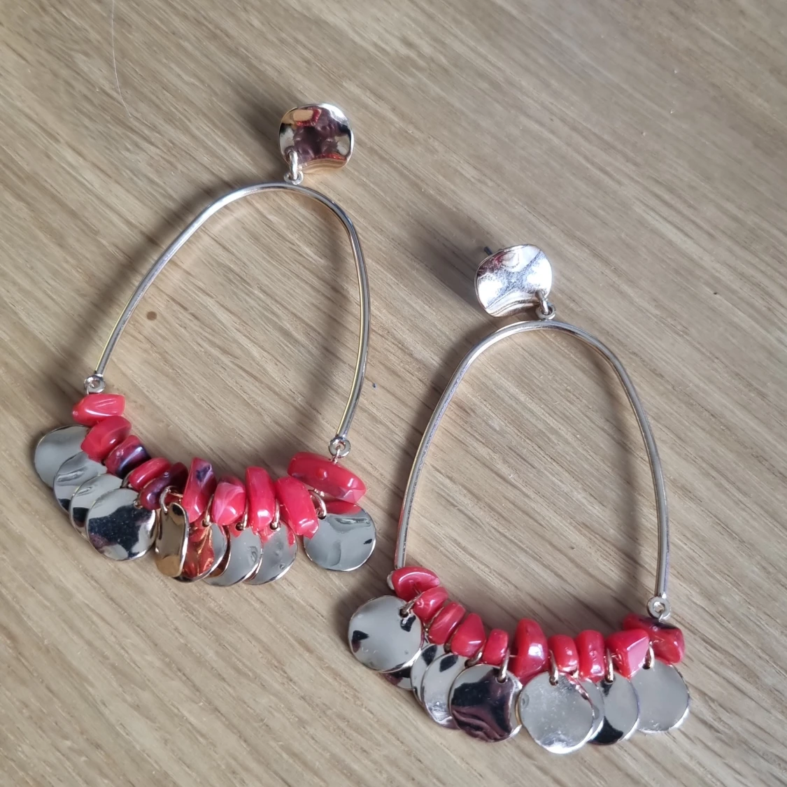 Stora hängande örhängen i guld med röda pärlor Ej tunga