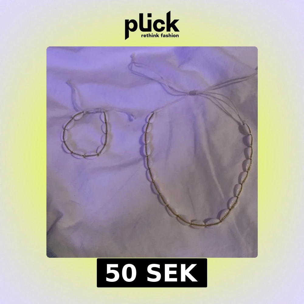 Snyggt set med halsband och armband dekorerade med vita snäckor och små guldfärgade pärlor. Perfekt för en strandlook eller sommarfest. Justerbara band för perfekt passform.