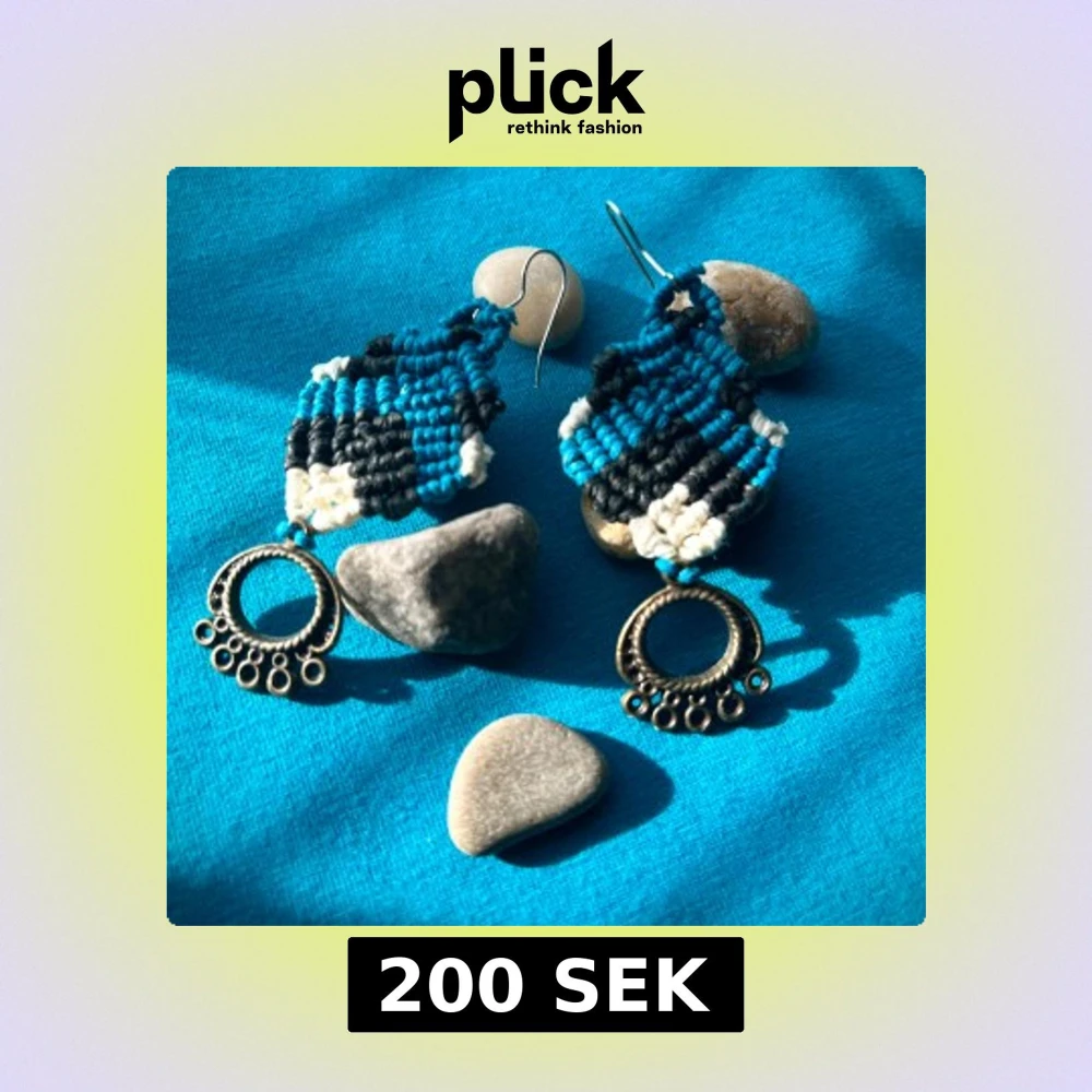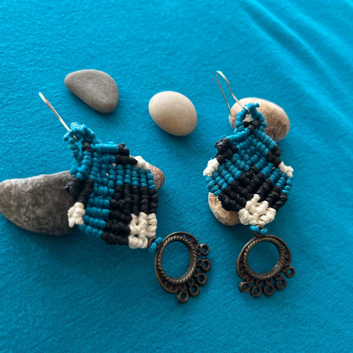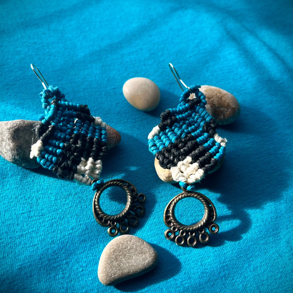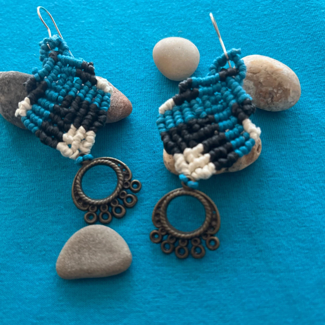 Unika örhängen med handknutna mönster i blått, svart och vitt. Nederdelen pryds av en antikbronsfärgad cirkel med små ringar. Perfekt för dig som gillar boho och färgstarka accessoarer.